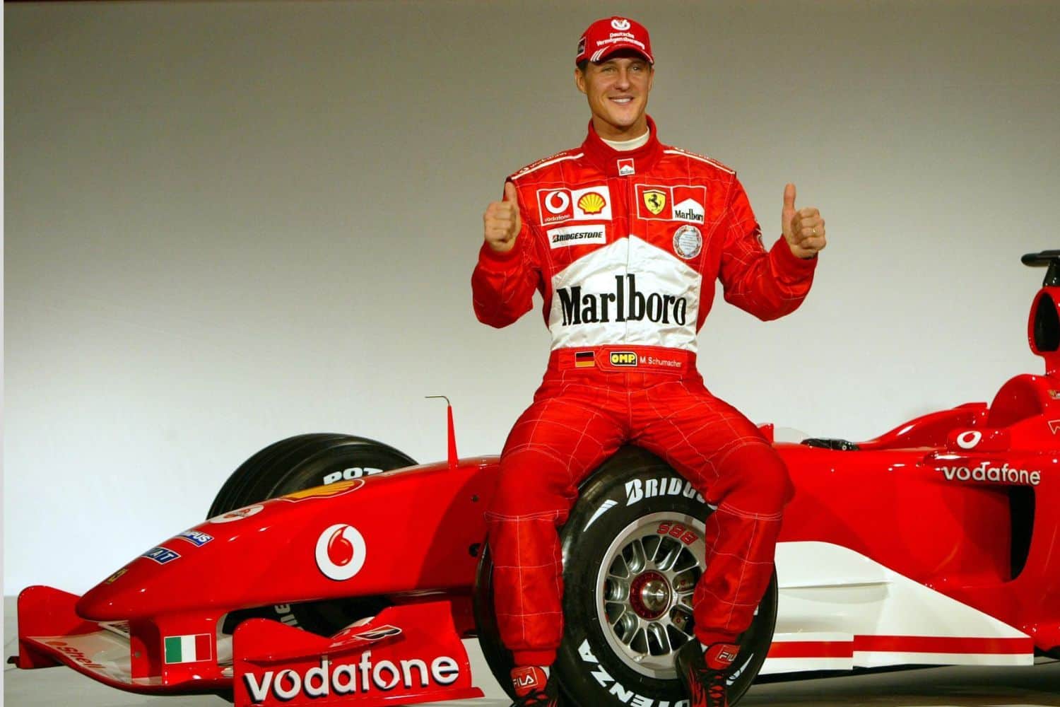 البدلة الحمراء الخاصة بفريق فيراري، والتي تحمل شعار “مارلبورو” المحظور حالياً في سباقات السيارات بسبب قوانين مكافحة التدخين، تميزت بتوقيع شوماخر على الصدر، ما أضفى عليها قيمة إضافية.