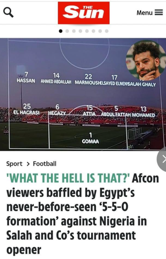 ونشرت الصحيفة تقرير عن خطة لعب الفراعنة أمام نيجيريا تحت عنوان “ما هذا بحق الجحيم؟” كتبت الصحيفة “حيرة مشاهدي كأس أمم أفريقيا بسبب تشكيلة مصر التي لم يسبق لها مثيل (5-5-0) ضد نيجيريا في المباراة الافتتاحية لصلاح ورفاقه”.