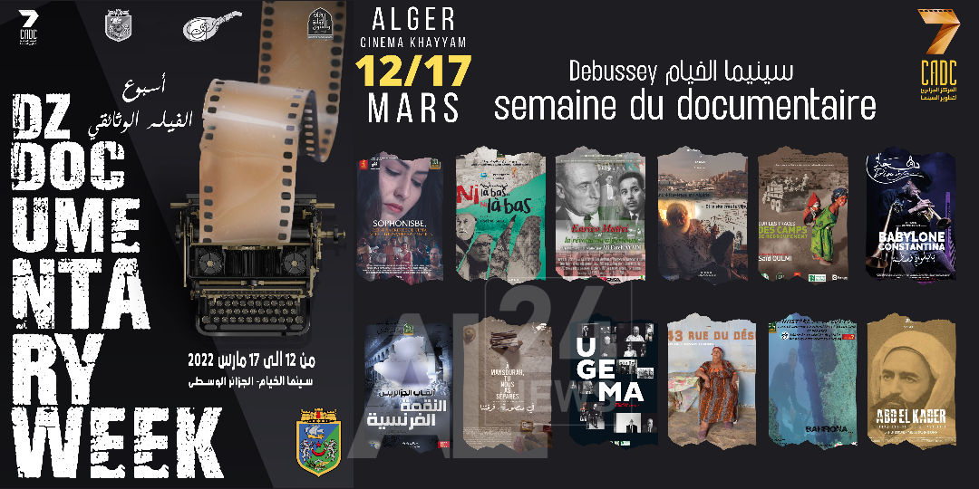 ينظم المركز الجزائري لتطوير السينما CADC بمساهمة المجلس الشعبي البلدي للجزائر الوسطى و ديوان ترقية الثقافة و الفنون للجزائر الوسطى “أسبوع الفيلم الوثائقي” في الفترة الممتدة من 12 الى 17 مارس 2022 بقاعة سينما الخيام .
