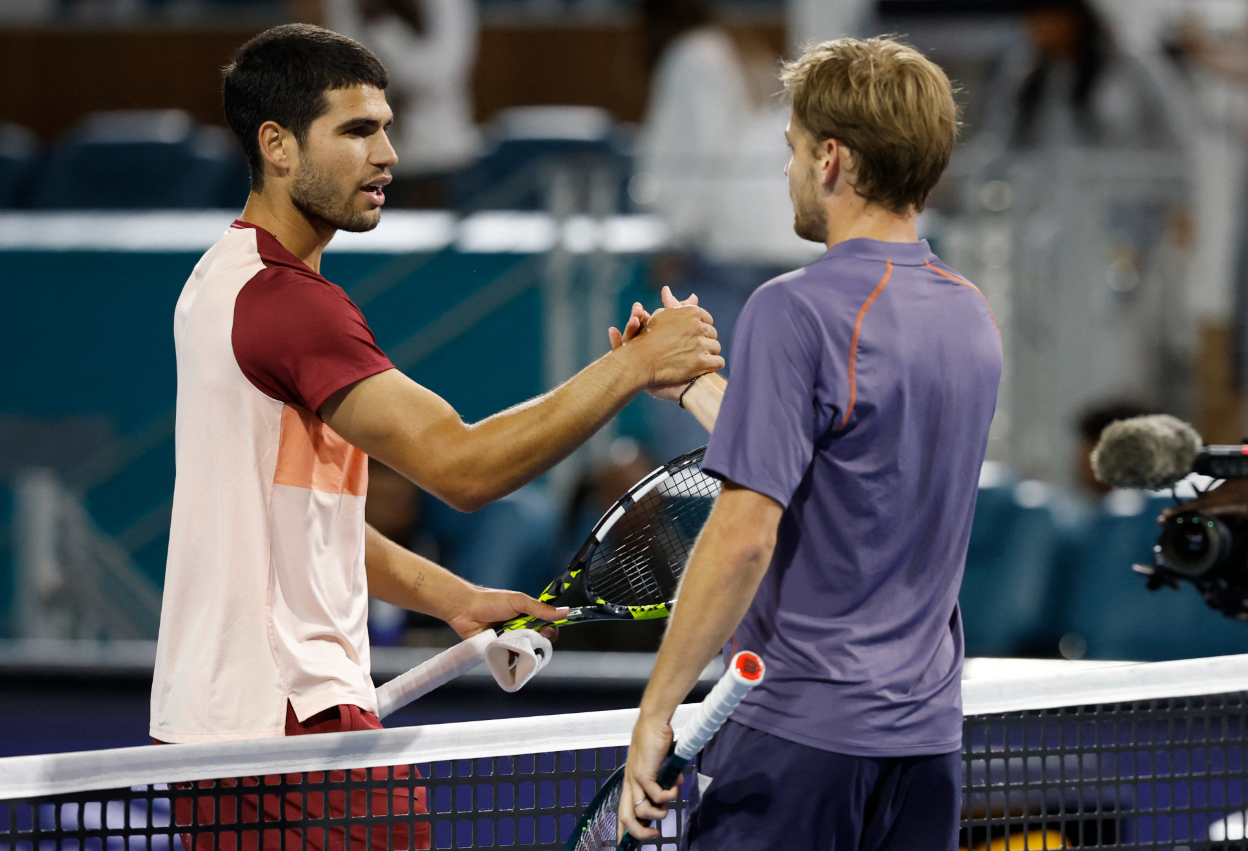 خسر النجم الإسبــاني كارلوس ألكاراز (5 -7) و(6 – 4) و(6 – 3) أمام البلجيكي ديفيد جوفين، في الدور الثاني من بطولة ميامي المفتوحة للتنس.