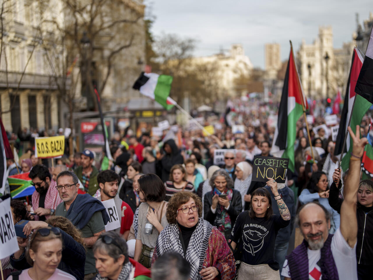 ورفع المتظاهرون الذين جابوا الشوارع المغلقة في العاصمة الإسبانية من محطة قطار “أتوتشا” إلى ساحة “بلازا ديل سول” المركزية اعلاما فلسطينية ولافتات كبيرة كتب عليها “الحرية لفلسطين” و”السلام لفلسطين” و”لا تتجاهلوا معاناة الفلسطينيين”.
