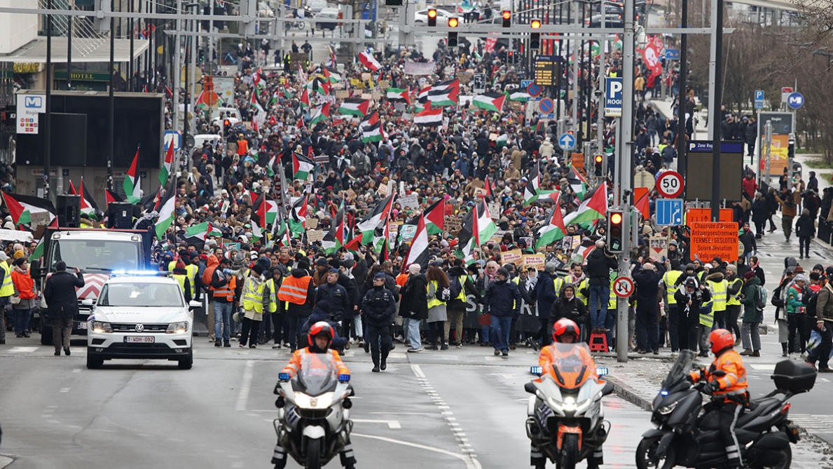 تظاهر الآلاف في العاصمة البلجيكية بروكسل، اليوم الأحد، تنديدا باستمرار العدوان الصهيوني على قطاع غزة وللمطالبة بوقف فوري لإطلاق النار في القطاع.