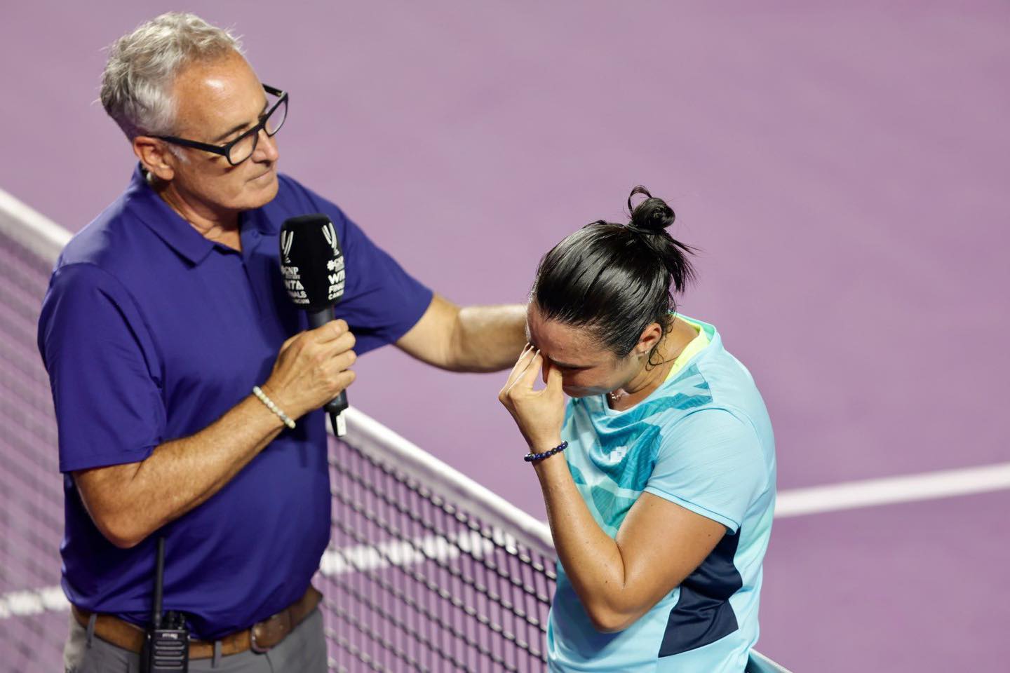 وبعد فوزها على “ماركيتا فوندروسوفا” في دور المجموعات لنهائيات اتحاد التنس النسائي 2023، قالت أنس: “أنا سعيدة جداً بالفوز، لكنني لم أكن سعيدة جداً مؤخراً. الوضع في العالم لا يجعلني سعيدة أشعر وكأنني… أنا آسفة” ثم أجهشت البطلة التونسية بالبكاء ولم تستطع إكمال كلمتها تحت تصفيقات الجماهير.