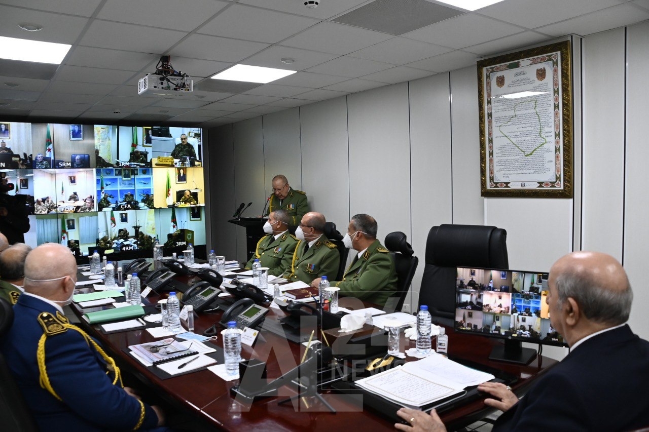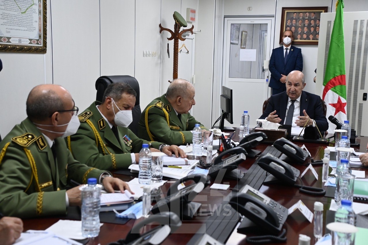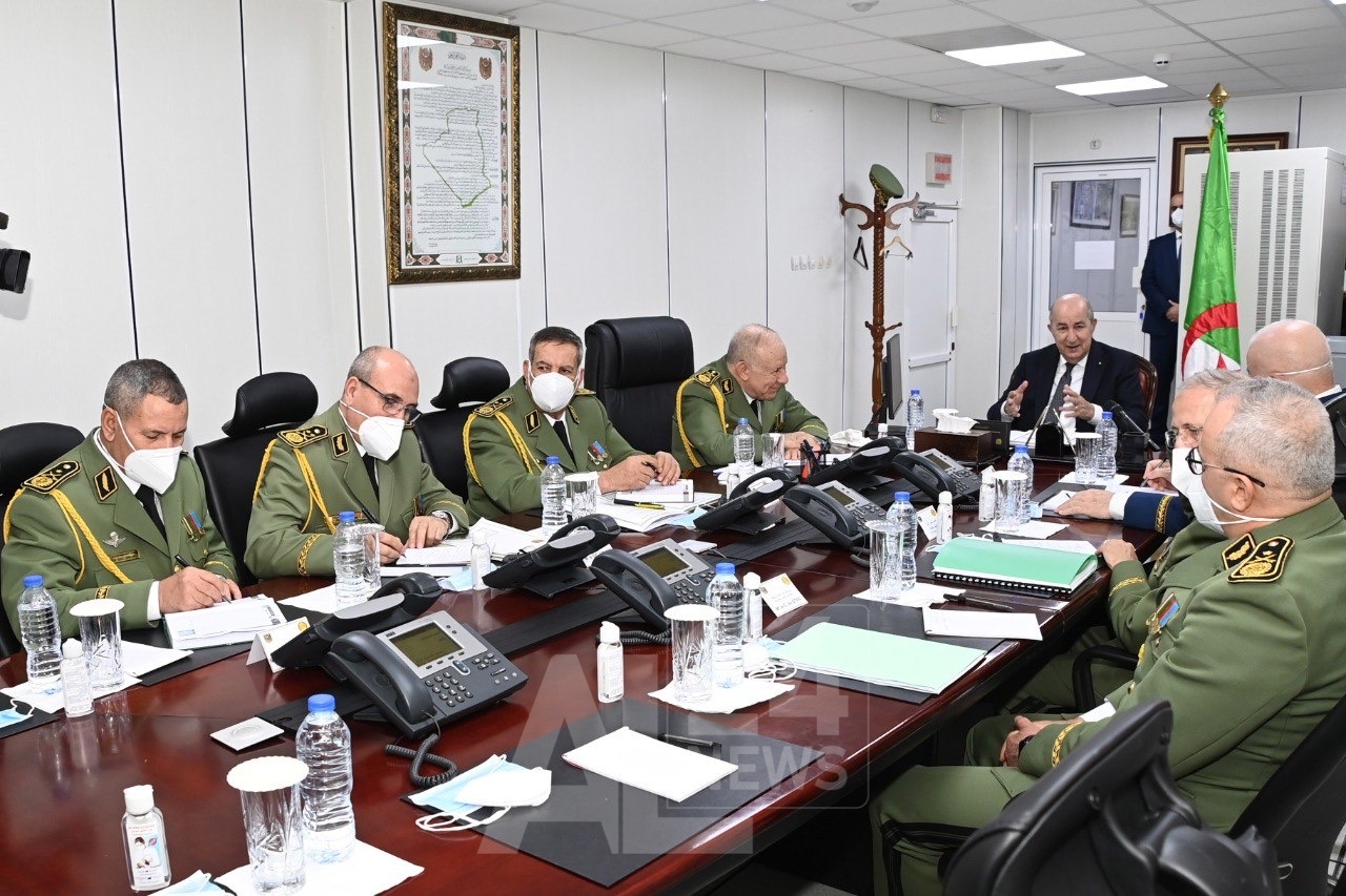 وخلال هذه الزيارة، “ترأس السيد رئيس الجمهورية اجتماع العمل الدوري الذي حضره كل من السيد الفريق أول، رئيس أركان الجيش الوطني الشعبي، والأمين العام لوزارة الدفاع الوطني وضباط ألوية وعمداء بوزارة الدفاع الوطني وأركان الجيش الوطني الشعبي، وعبر تقنية التخاطب عن بعد، قادة القوات والحرس الجمهوري والدرك الوطني والنواحي العسكرية والوحدات الكبرى للجيش الوطني الشعبي”.