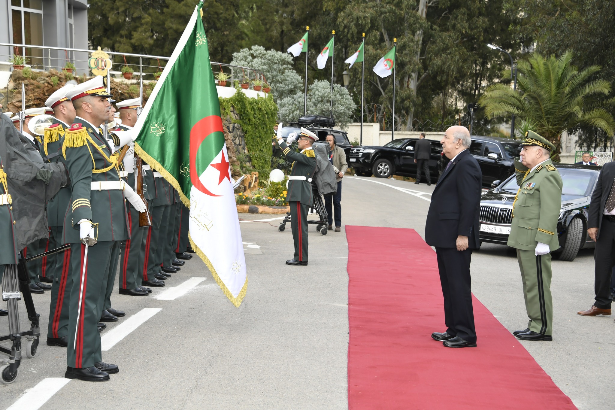 وبعد الاستماع الى النشيد الوطني، قدمت للرئيس تبون التشريفات من قبل تشكيلات من مختلف قوات الجيش الجزائري، التي أدت له التحية العسكرية.
