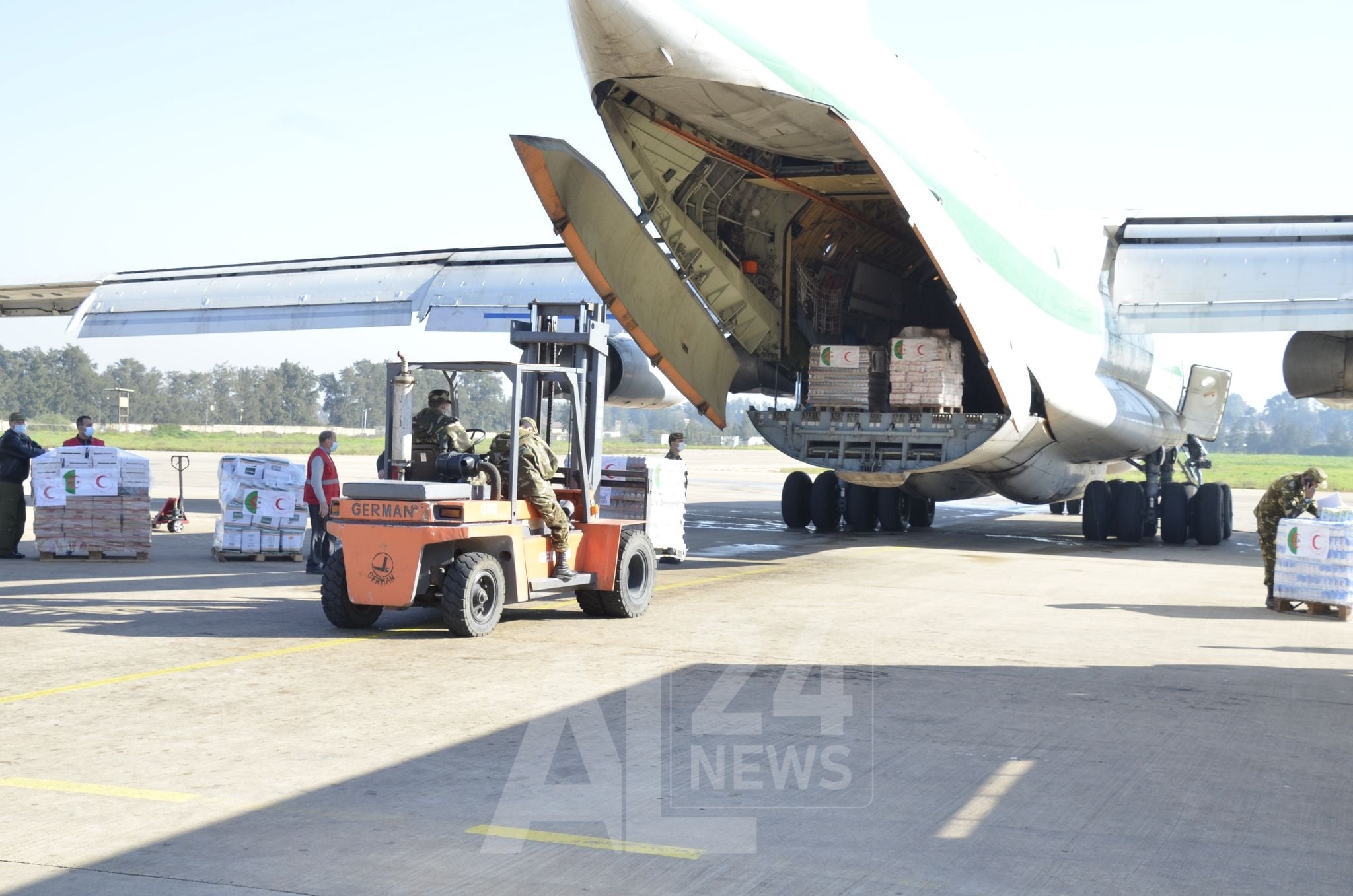 تم اليوم الاثنين بالقاعدة الجوية لبوفاريك (الناحية العسكرية الأولى) بالجزائر شحن مساعدات إنسانية متكونة من 108 طن من المواد الغذائية و400 ألف جرعة من اللقاح المضاد لفيروس كوفيد-19 موجهة على مراحل الى دولة مالي , وهذا في إطار تضامن الجزائر مع دول الجوار, حسب ما أفاد به بيان لوزارة الدفاع الجزائرية.