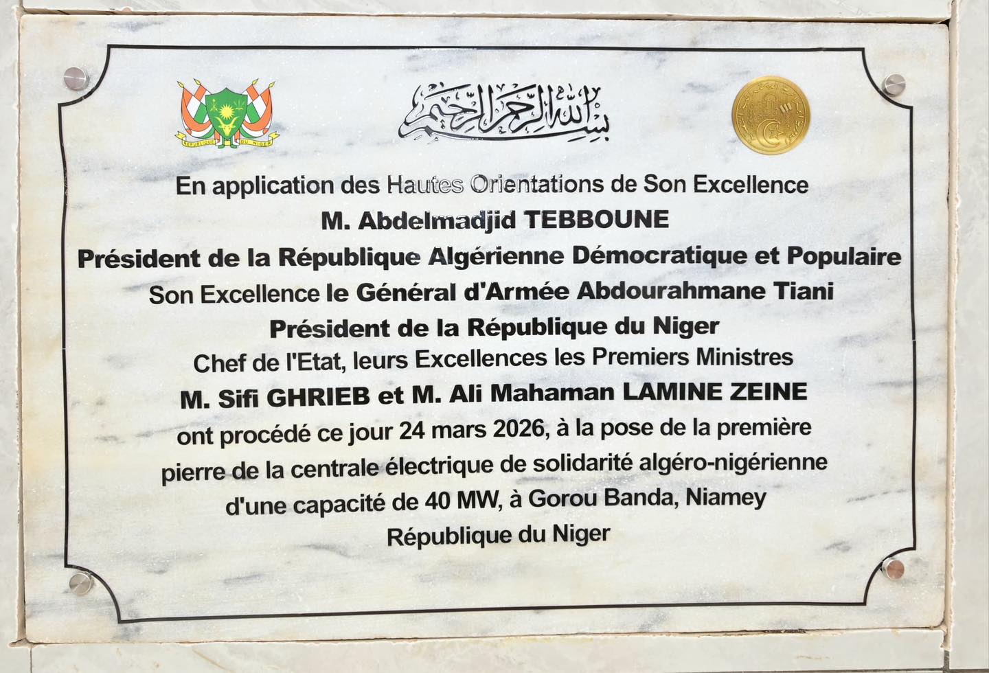 وضع الوزير الأول الجزائري، سيفي غريب، اليوم الثلاثاء، مع نظيره النيجري، علي لامين زين، حجر الأساس لمشروع إنشاء محطة توليد الكهرباء للتضامن بقدرة 40 ميغاوات بمنطقة غورو باندا بالعاصمة نيامي.