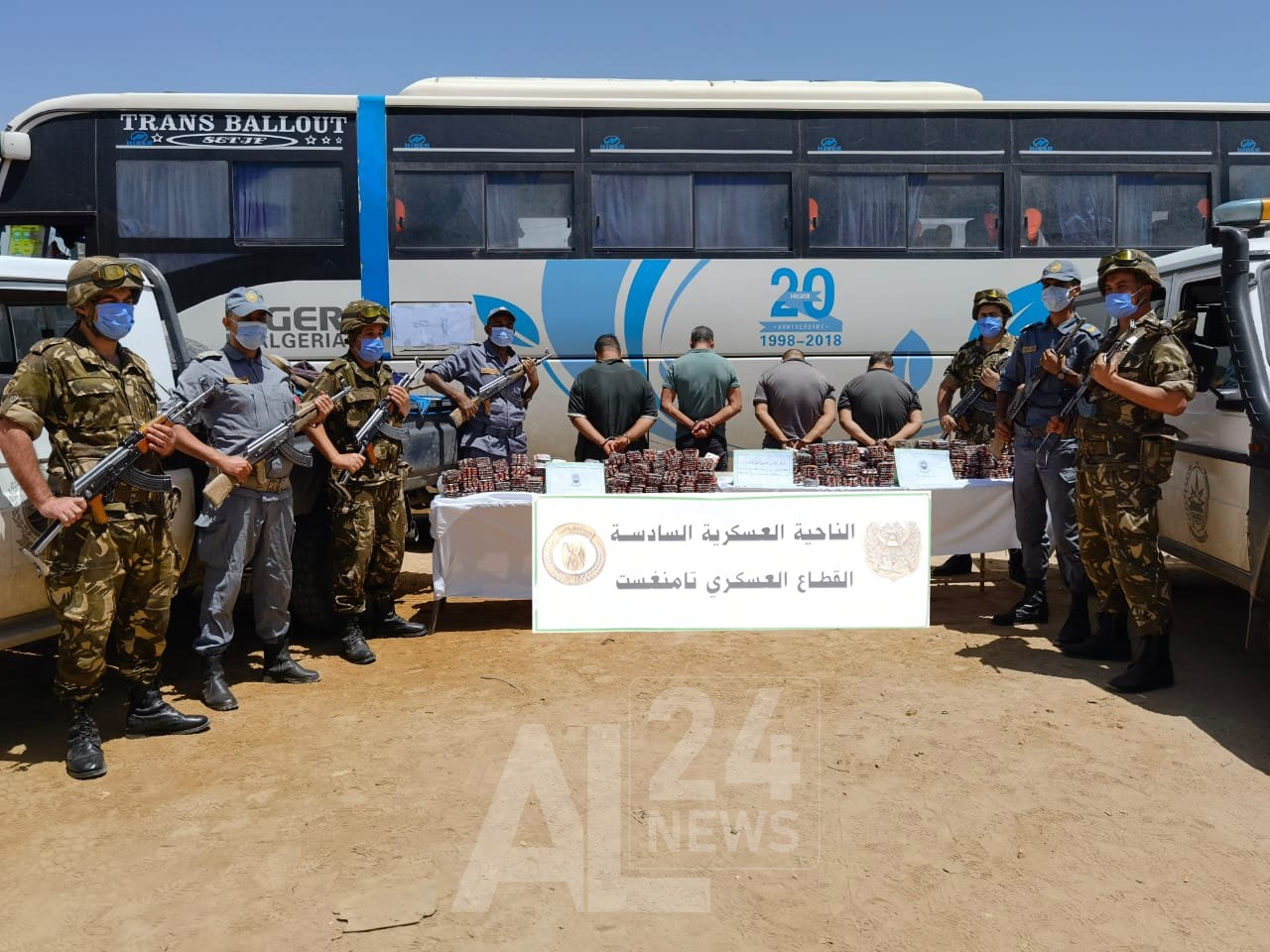 و تم “توقيف (14) شخصا وضبط (05) بنادق صيد ومسدس (01) آلي و(80519) علبة من مادة التبغ و(3367) وحدة من مختلف المشروبات وكميات من المواد الغذائية الموجهة للتهريب تقدر بـ (105) طن بكل من ورقلة والوادي وبسكرة وسطيف وباتنة وإن ڤزام.”