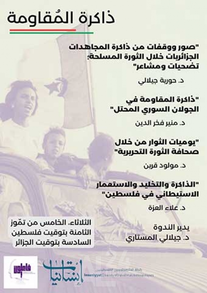 الجزائر : بمناسبة الذكرى الستين للاستقلال، ينظم مركز «فاعلون» للبحث في الأنثروبولوجيا والعلوم الإنسانية والاجتماعية بالجزائر، بالتعاون مع رابطة الأنثروبولوجيين الفلسطينيين «إنسانيات»، ندوة تحت عنوان: «ذاكرة المقاومة»، وذلك بمشاركة باحثات وباحثين من الجزائر، وفلسطين، وسوريا.