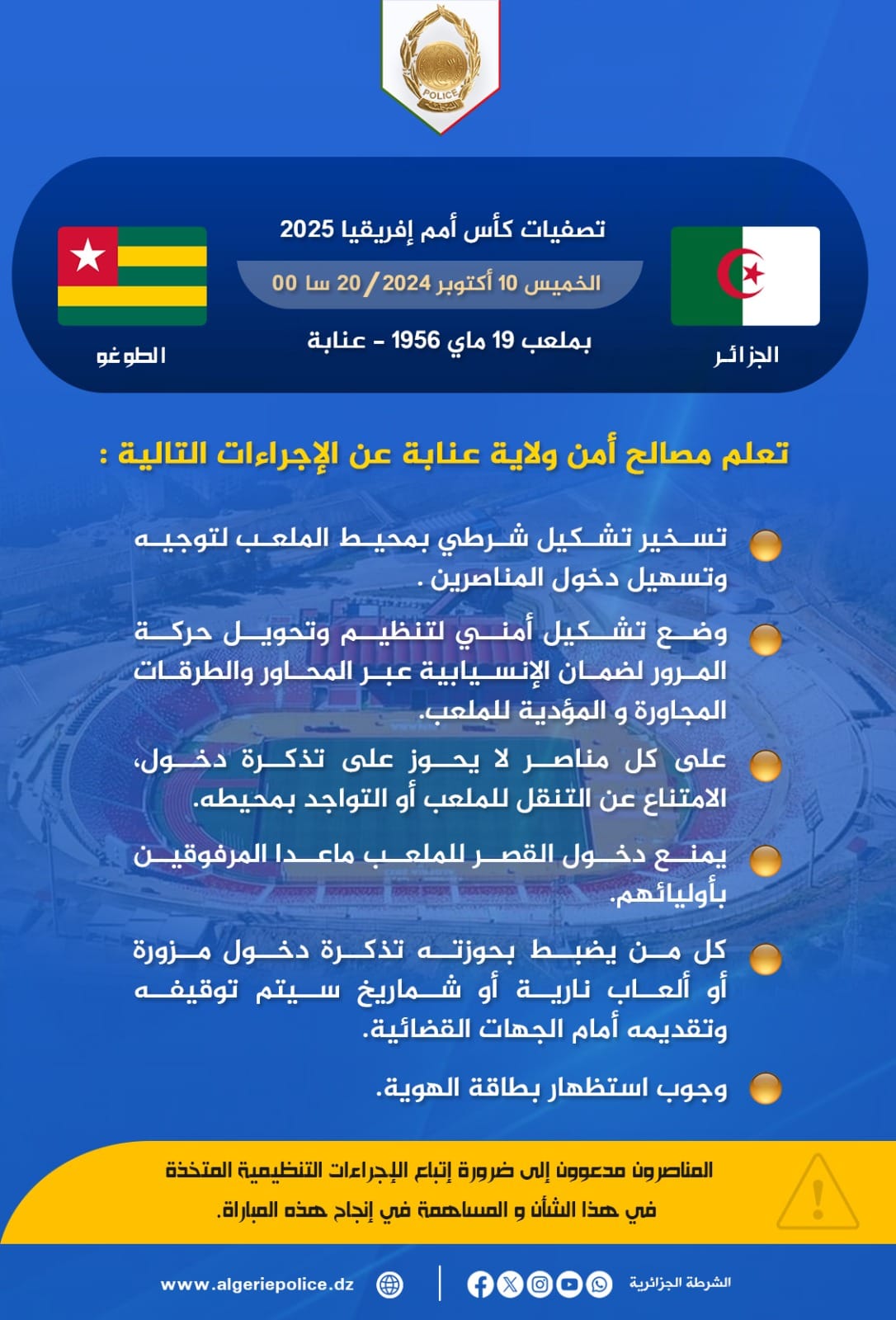 ومن جهة أخرى، أصدرت مصالح أمن ولاية عنابة بيانًا هامًا اليوم الثلاثاء بشأن اللقاء المرتقب هذا الخميس بين المنتخب الوطني ونظيره الطوغولي.