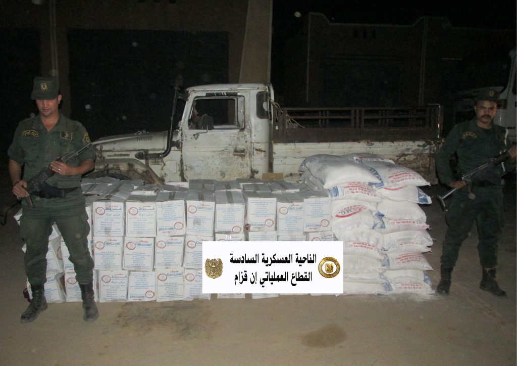 وقد ضبطت بكل من ولايات: تمنراست وبرج باجي مختار وإن ڤزام وجانت، (69) شخصا و (21) مركبة و(50) مولدا كهربائيا و(29) مطرقة ضغط و(19) طن من خليط خام الذهب والحجارة، بالإضافة إلى كميات من المتفجرات ومعدات تفجير وتجهيزات أخرى تستعمل في عمليات التنقيب غير المشروع عن الذهب، في حين تم توقيف (62) شخصا وضبط (17) بندقية صيد ومسدس (01) آلي و(16609) خرطوشة وكميات ضخمة من المواد الغذائية الموجهة للتهريب والمضاربة تُقدر بـ (258) طن وكذا (80) قنطارا من مادة التبغ و(129255) وحدة من مختلف الألعاب النارية و(6030) وحدة من مختلف المشروبات و(29,5) طن من النفايات النحاسية، وهذا بكل من ورﭭلة والوادي والأغواط وبسكرة والجلفة وإن ڤزام وتيارت ومعسكر وسوق أهراس وباتنة وسكيكدة.