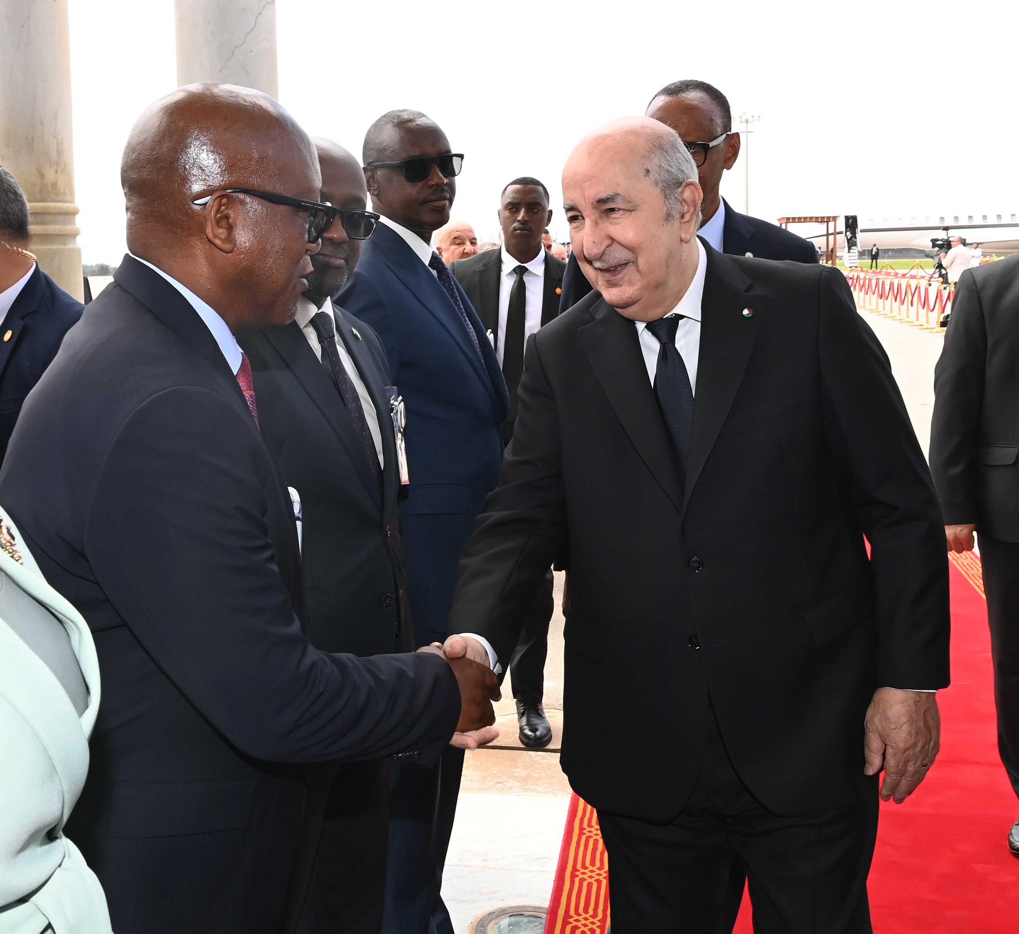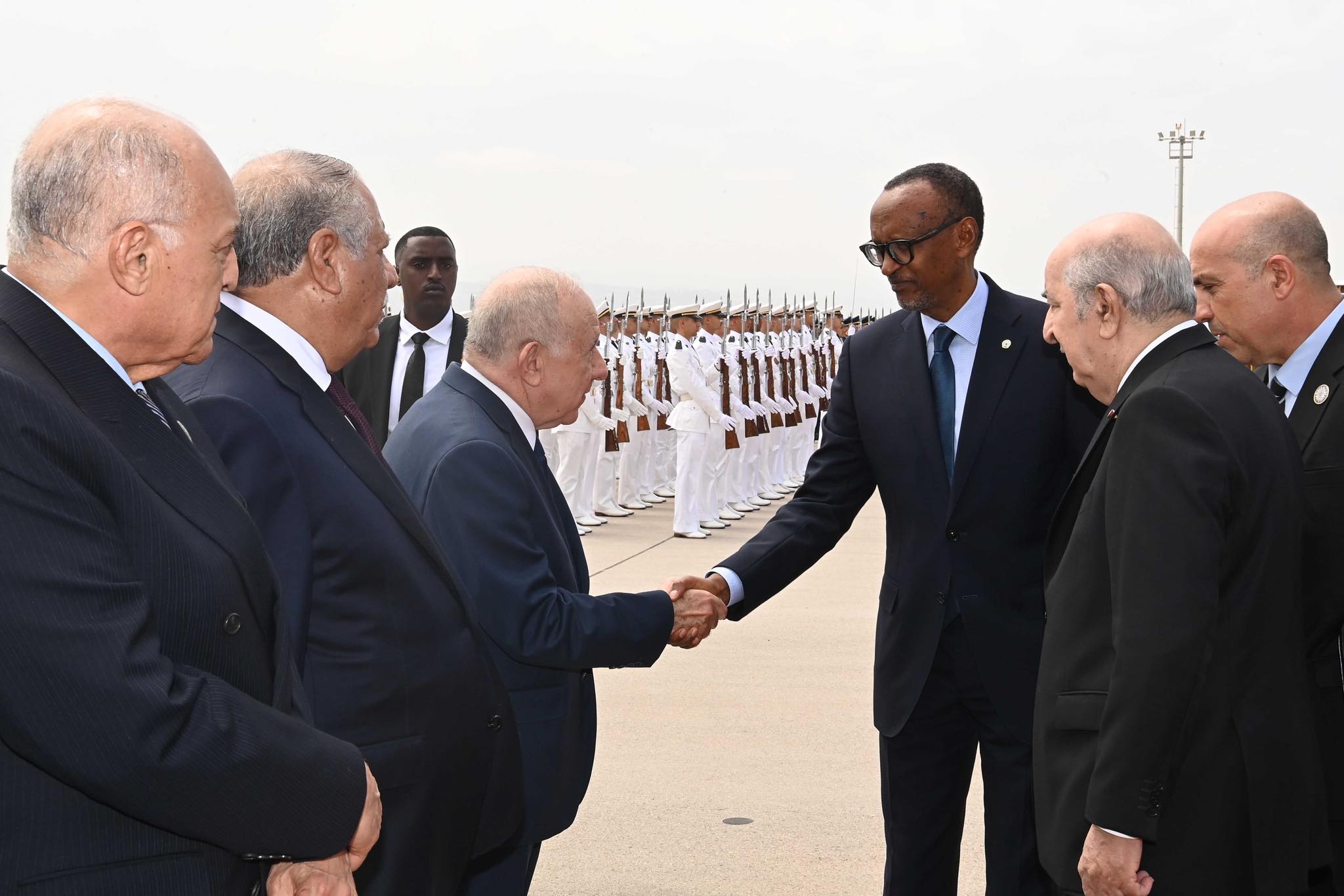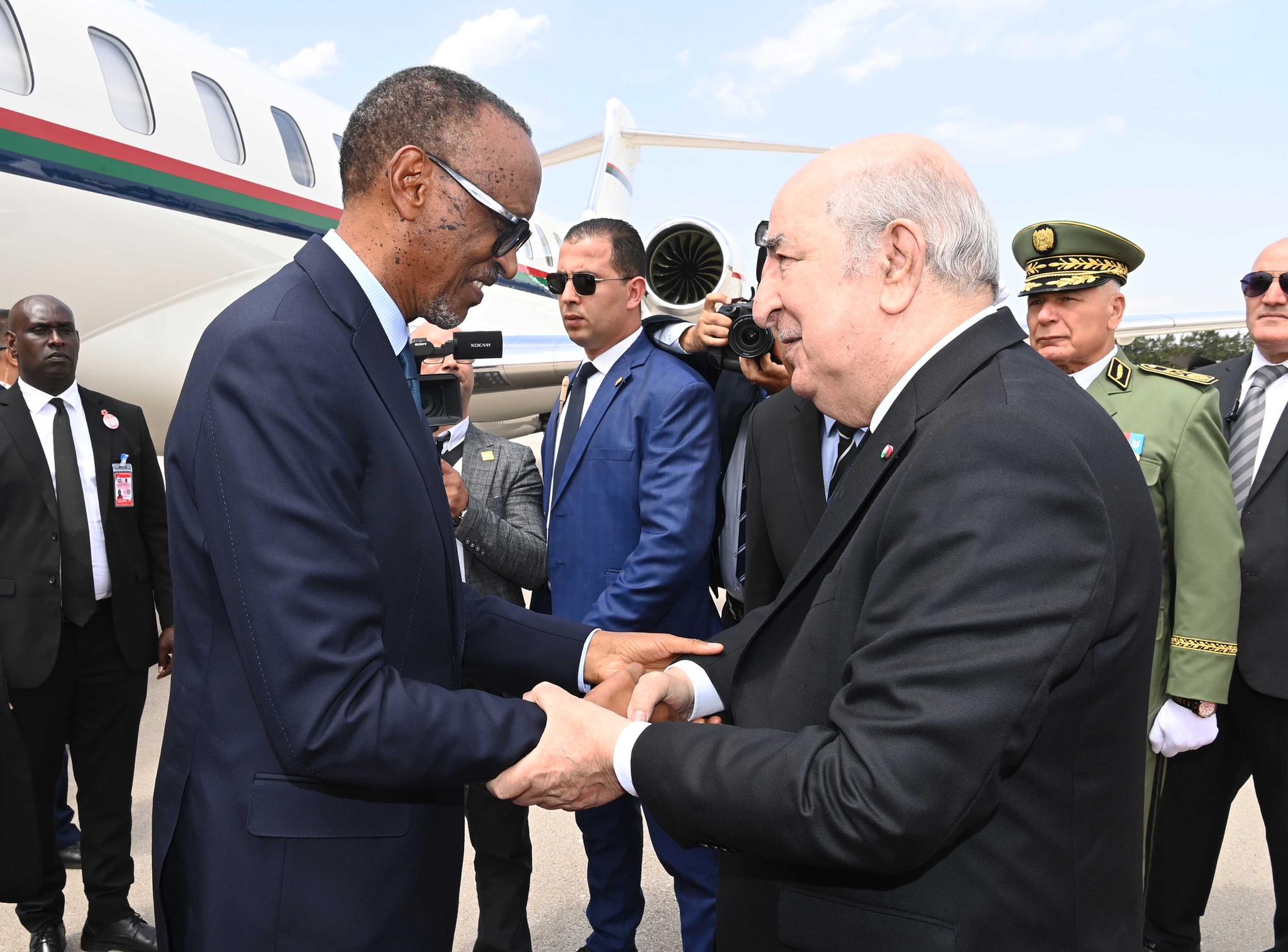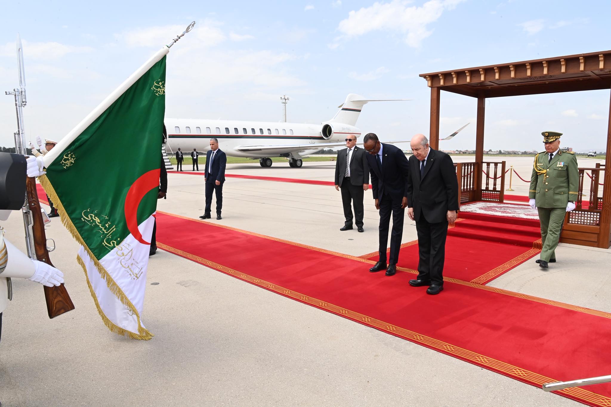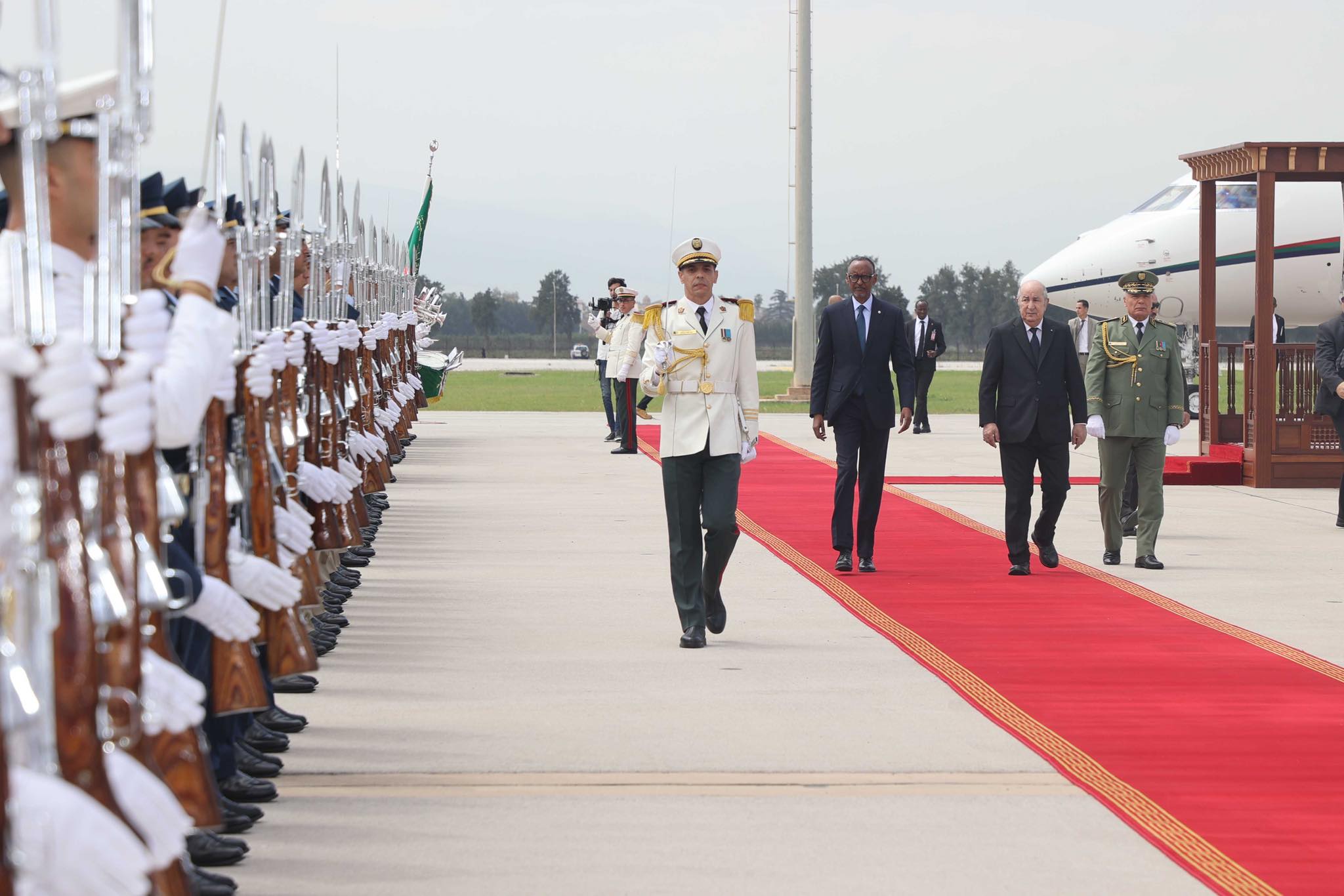 وخصّ الرئيس الجزائري، عبد المجيد تبون، ضيف الجزائر بول كاغامي، باستقبال رسمي بمطار هواري بومدين الدولي. واستمع الرئيسان إلى النشيدين الوطنيين، كما استعرضا مختلف تشكيلات الجيش الوطني الشعبي التي أدت لهما التحية الشرفية.