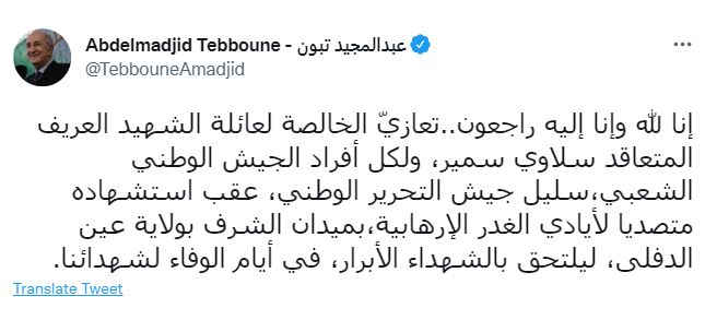 وكتب الرئيس تبون عبر حسابه الرسمي بموقع “تويتر “:”إنا لله وإنا إليه راجعون. تعازي الخالصة لعائلة الشهيد العريف المتعاقد سلاوي سمير، ولكل أفراد الجيش الوطني الشعبي، سليل جيش التحرير الوطني، عقب استشهاده متصديا لأيادي الغدر الإرهابية، بميدان الشرف بولاية عين الدفلى، ليلتحق بالشهداء الأبرار، في أيام الوفاء لشهدائنا”.