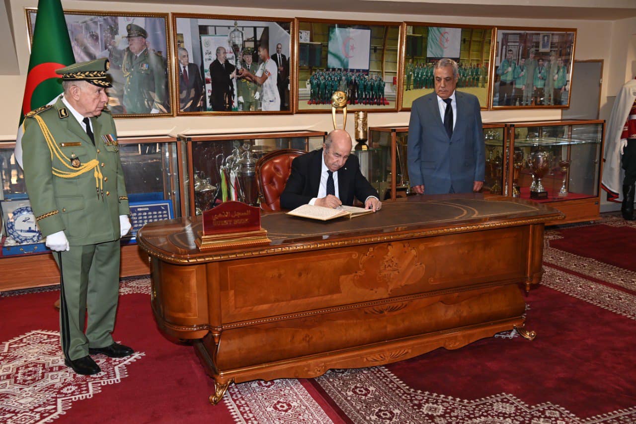 وقع الرئيس الجزائري، عبد المجيد تبون، اليوم الخميس، على السجل الذهبي لمتحف المركب الرياضي العسكري الشهيد مسعود بوجريو وتلقى تذكارا بالمناسبة أهداه إياه الفريق أول رئيس أركان الجيش الوطني الشعبي الجزائري قبل المغادرة.