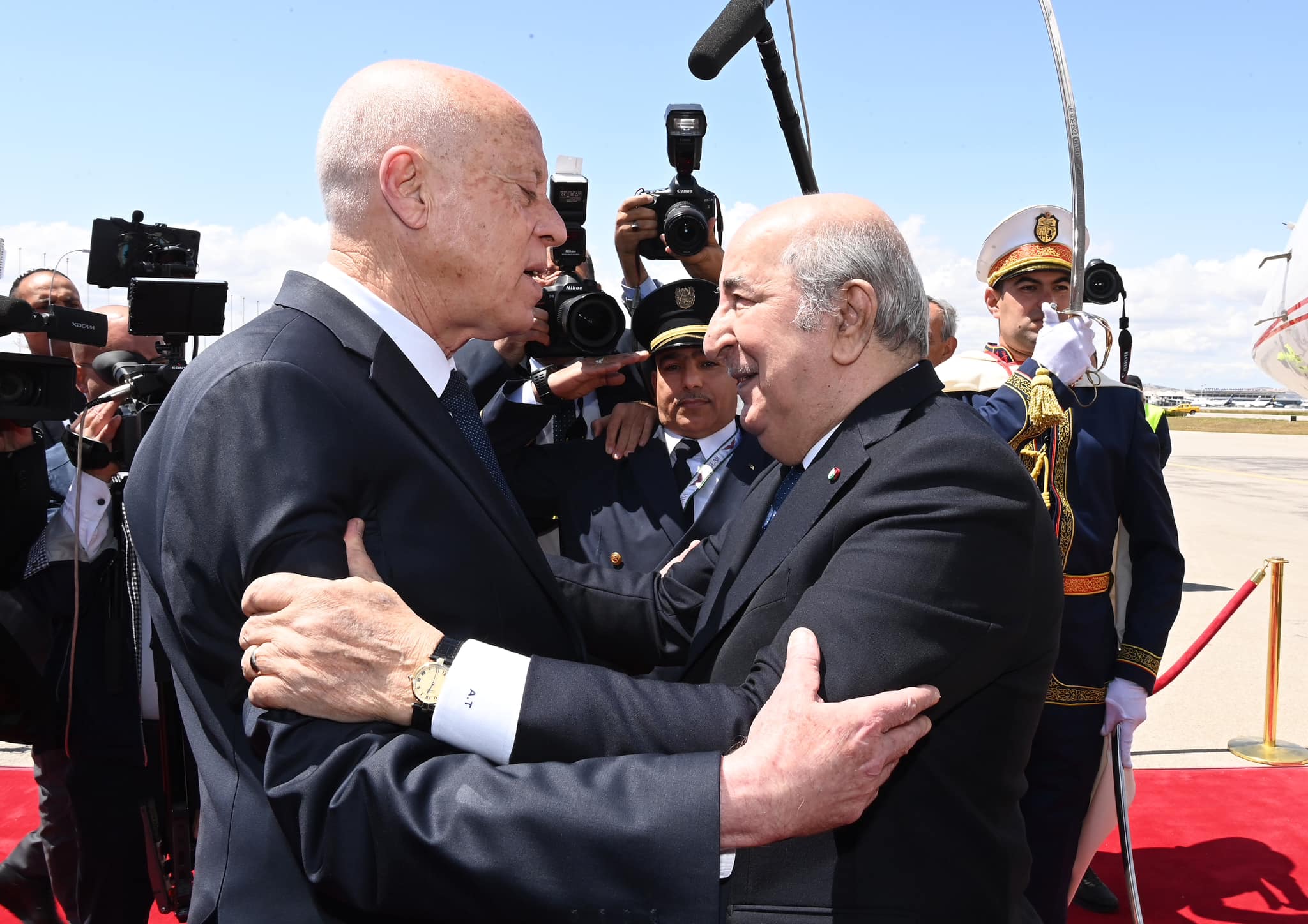 بدوره، جدد الرئيس قيس سعيد ترحيبه بالرئيس الجزائري ، مشيدا بالوقوف الدائم للجزائر إلى جانب بلاده. وأضاف قائلا: “الله يحمي تونس والجزائر وينصر الحق”.