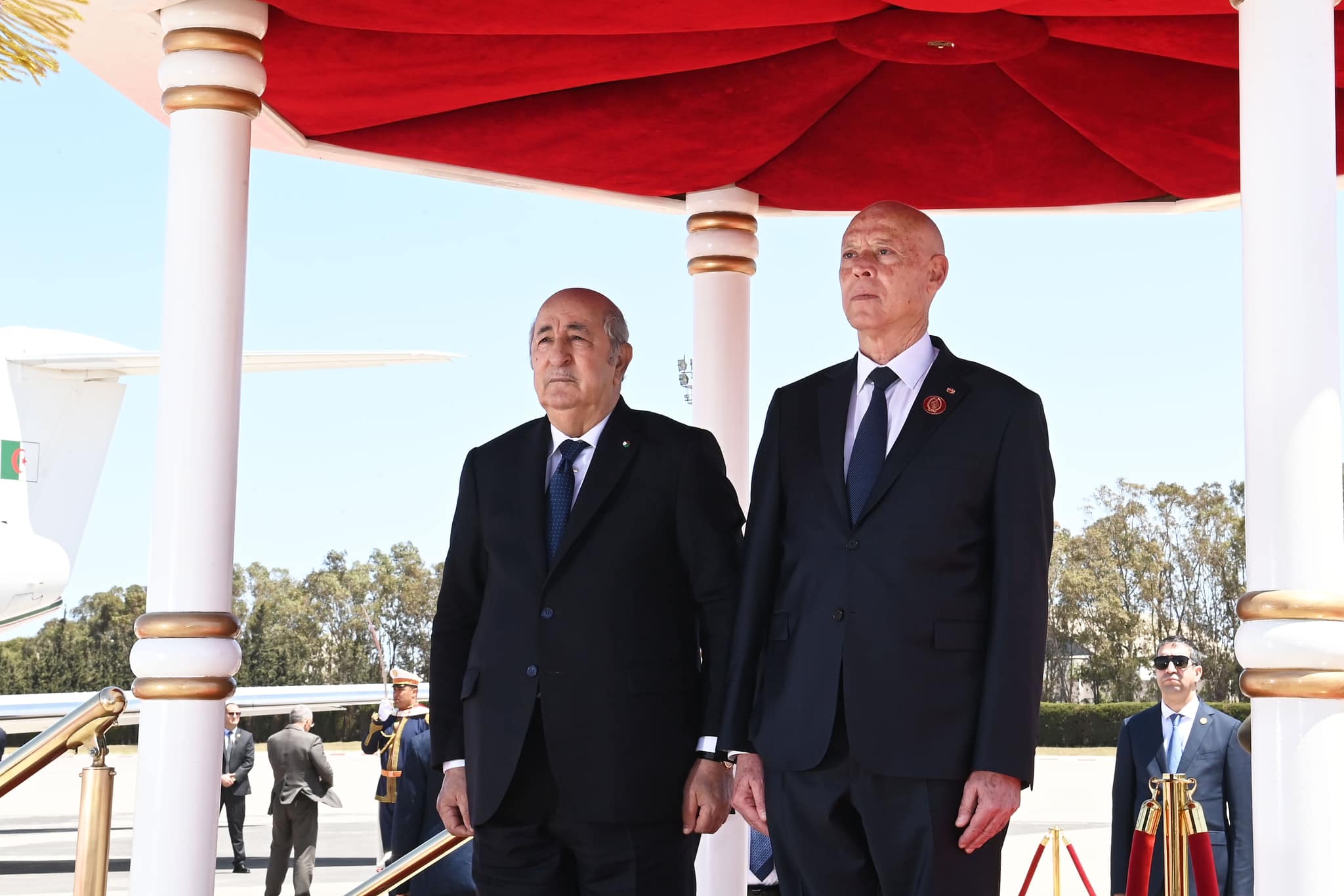 وخلال مراسم الاستقبال، استمع الرئيسان إلى النشيدين الوطنيين للبلدين قبل أن يستعرضا تشكيلة من حرس الشرف التونسي أدت لهما التحية الشرفية.