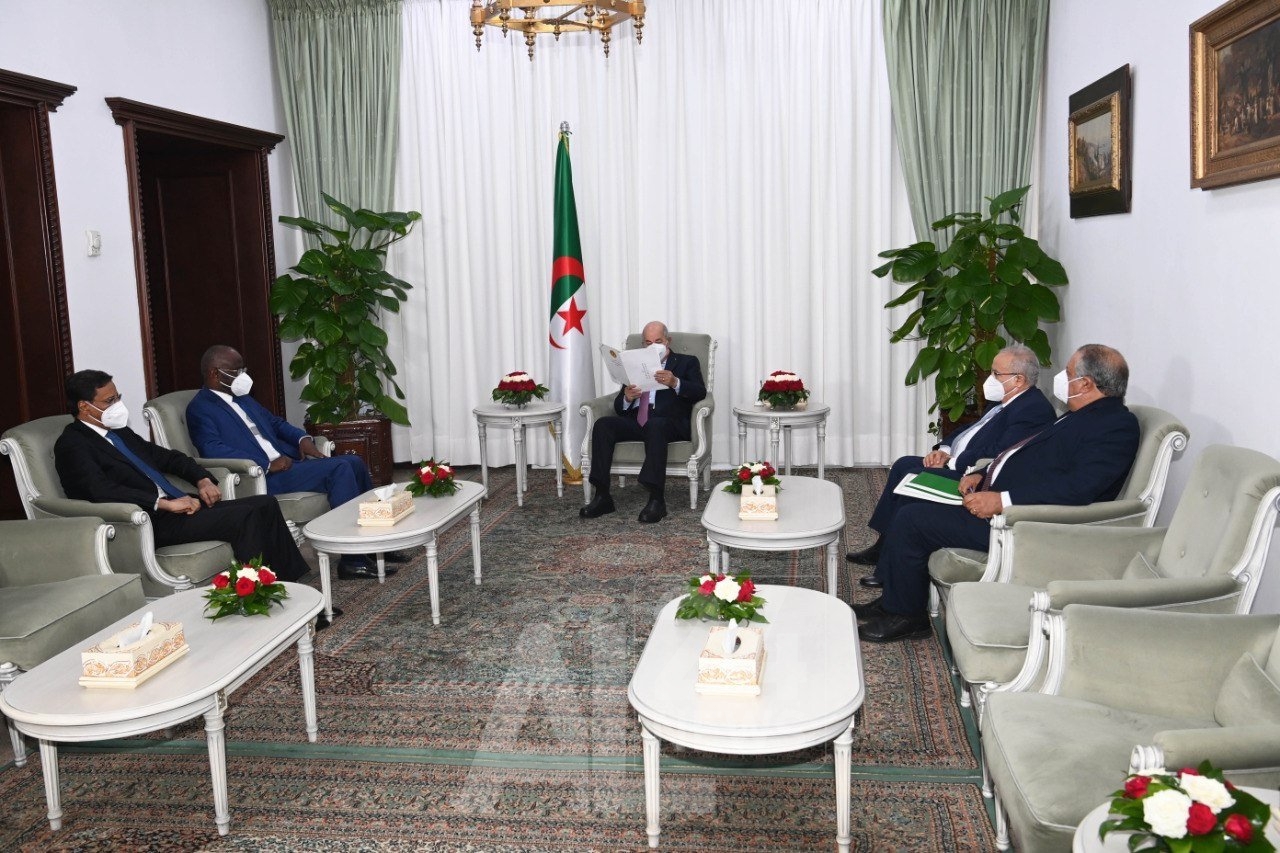 وأضاف البيان: “جرى الاستقبال بمقر رئاسة الجمهورية الجزائرية بحضور وزير الشؤون الخارجية والجالية الوطنية بالخارج, السيد رمطان لعمامرة, والمستشار لدى رئيس الجمهورية المكلف بالشؤون القانونية والقضائية، مدير ديوان رئاسة الجمهورية بالنيابة, السيد بوعلام بوعلام”.