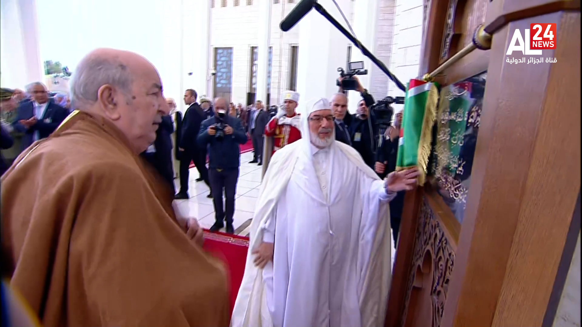 وقد تابع الرئيس الجزائري بالقاعة الشرفية للجامع شريطا وثائقيا حول مختلف مرافق وهياكل هذا الصرح الحضاري والديني.