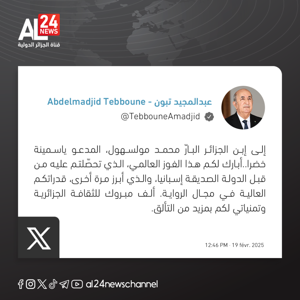 وجاء في تغريدة الرئيس تبون: “إلى ابن الجزائر البارّ محمد مولسهول، المدعو ياسمينة خضرا.. أبارك لكم هذا الفوز العالمي، الذي تحصّلتم عليه من قبل الدولة الصديقة إسبانيا، والذي أبرز مرة أخرى، قدراتكم العالية في مجال الرواية. ألف مبروك للثقافة الجزائرية وتمنياتي لكم بمزيد من التألق”.