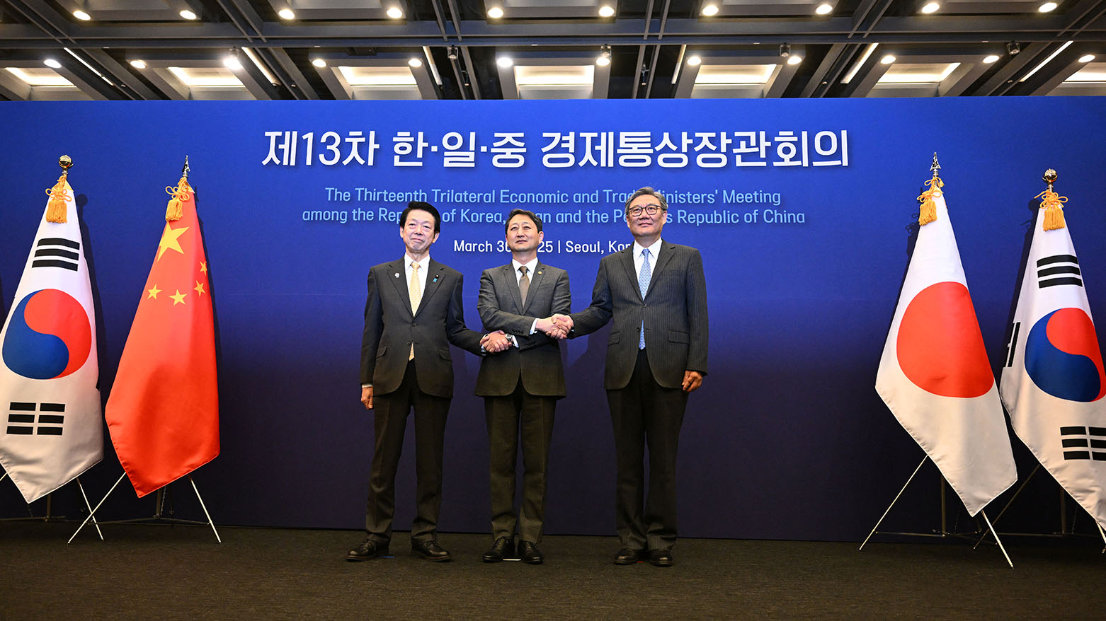 وحضر الاجتماع وزير الصناعة الكوري الجنوبي آن دوك غون، ونظيره الياباني يوجي موتو، ووزير التجارة الصيني وانغ وينتاو.