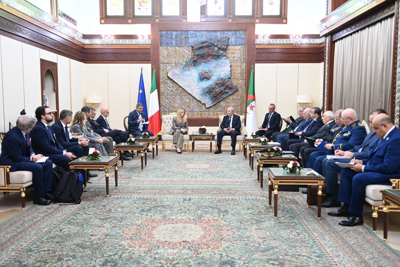 وقبلها، كان الرئيس تبون قد أجرى محادثات على انفراد مع رئيسة مجلس الوزراء الايطالي التي شرعت، في وقت سابق من نهار اليوم، في زيارة عمل وصداقة إلى الجزائر.