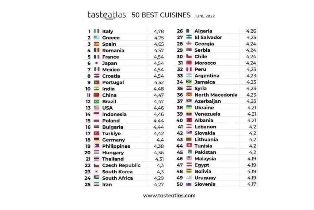 فيما حلت الجزائر بالمرتبة 26 عالميا ضمن قائمة ضمت أفضل 50 مطبخا من دول عديدة عبر مختلف قارات العالم.