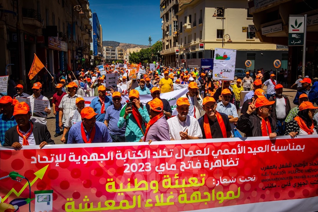 ووسط إجراءات أمنية مشددة، شارك المغاربة في وقفات ومسيرات دعت إليها نقابات في الرباط وعدد من المدن، بمناسبة عيد العمال، مرددين هتافات داعية للحد من ارتفاع الأسعار وتحسين القدرة الشرائية للمواطنين الذين يعيشون للعام الثاني على التوالي تحت وطأة الغلاء الفاحش، ورافعين لافتات تطالب بالرفع من الأجور وإنصاف العمال وتلبية حقوقهم.