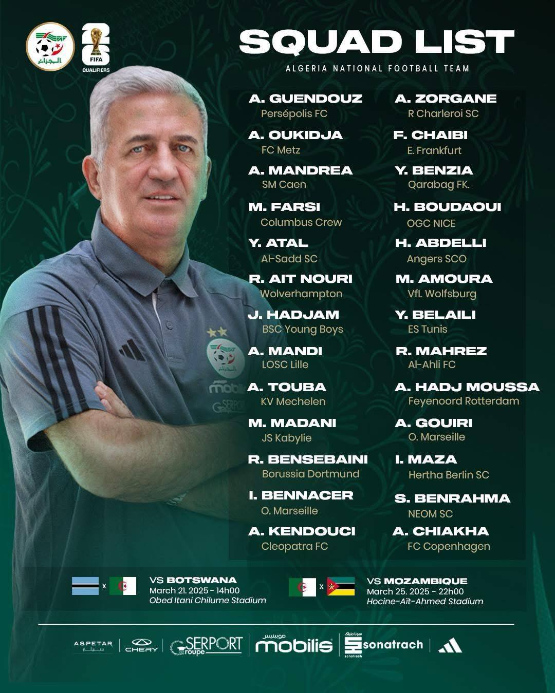 وجاءت القائمة التي نشرت عبر الصفحة الرسمية للاتحاد الجزائري لكرة القدم على النحو التالي: