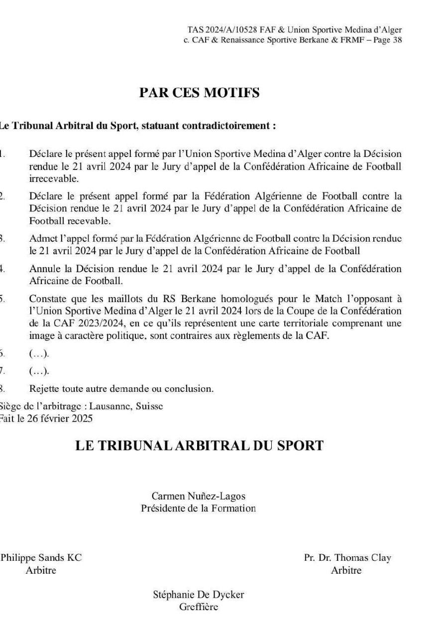 ونشرت “تاس” بيانًا رسميًا يتكون من 38 صفحة، توضح فيه تفاصيل القضية التي كسبها الطرف الجزائري لصالحه بقوة القانون