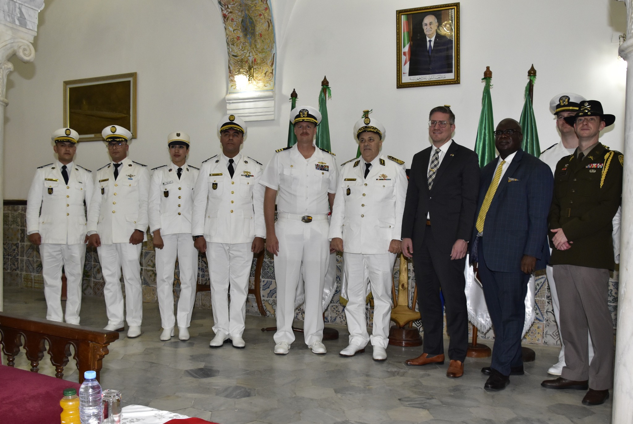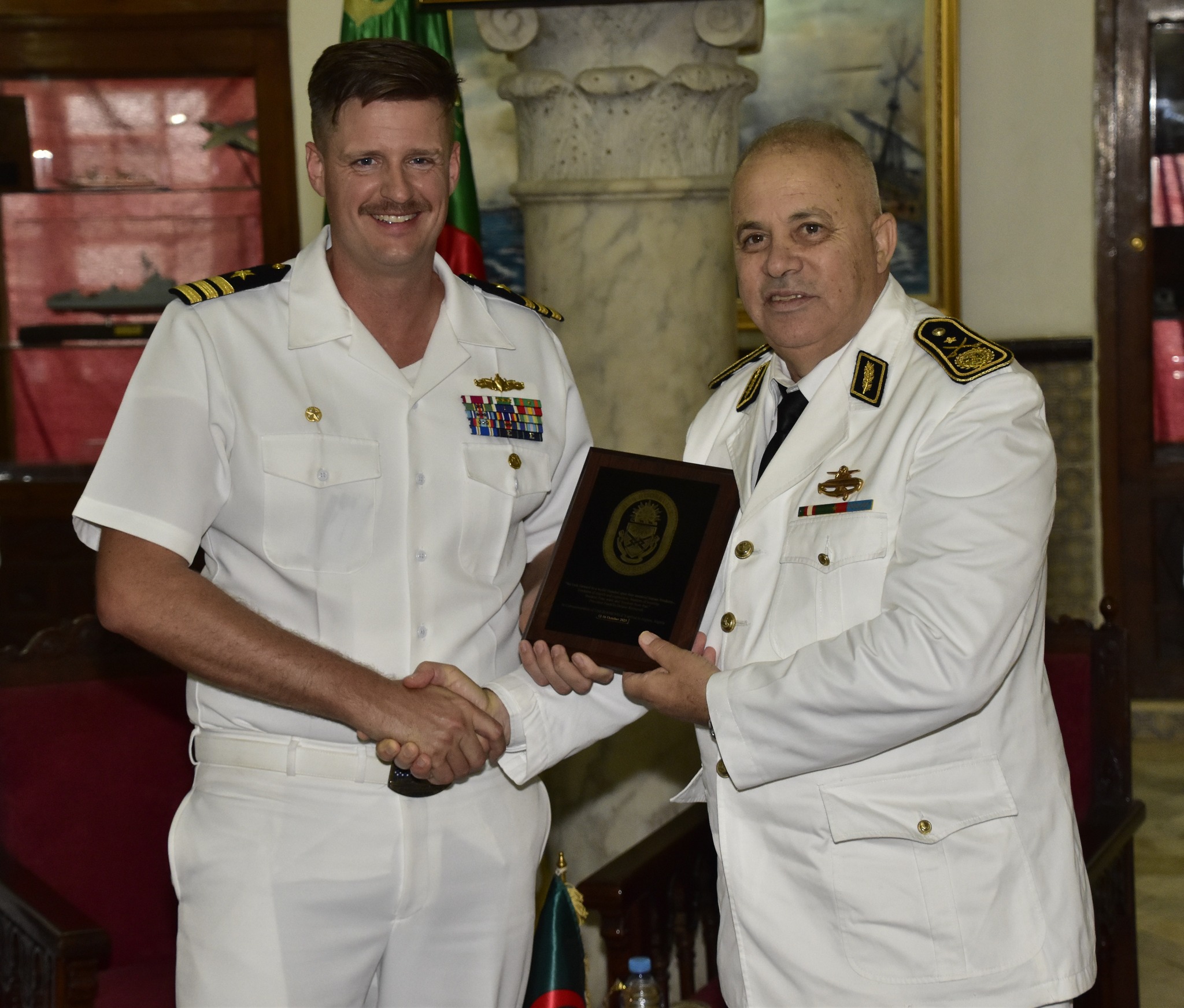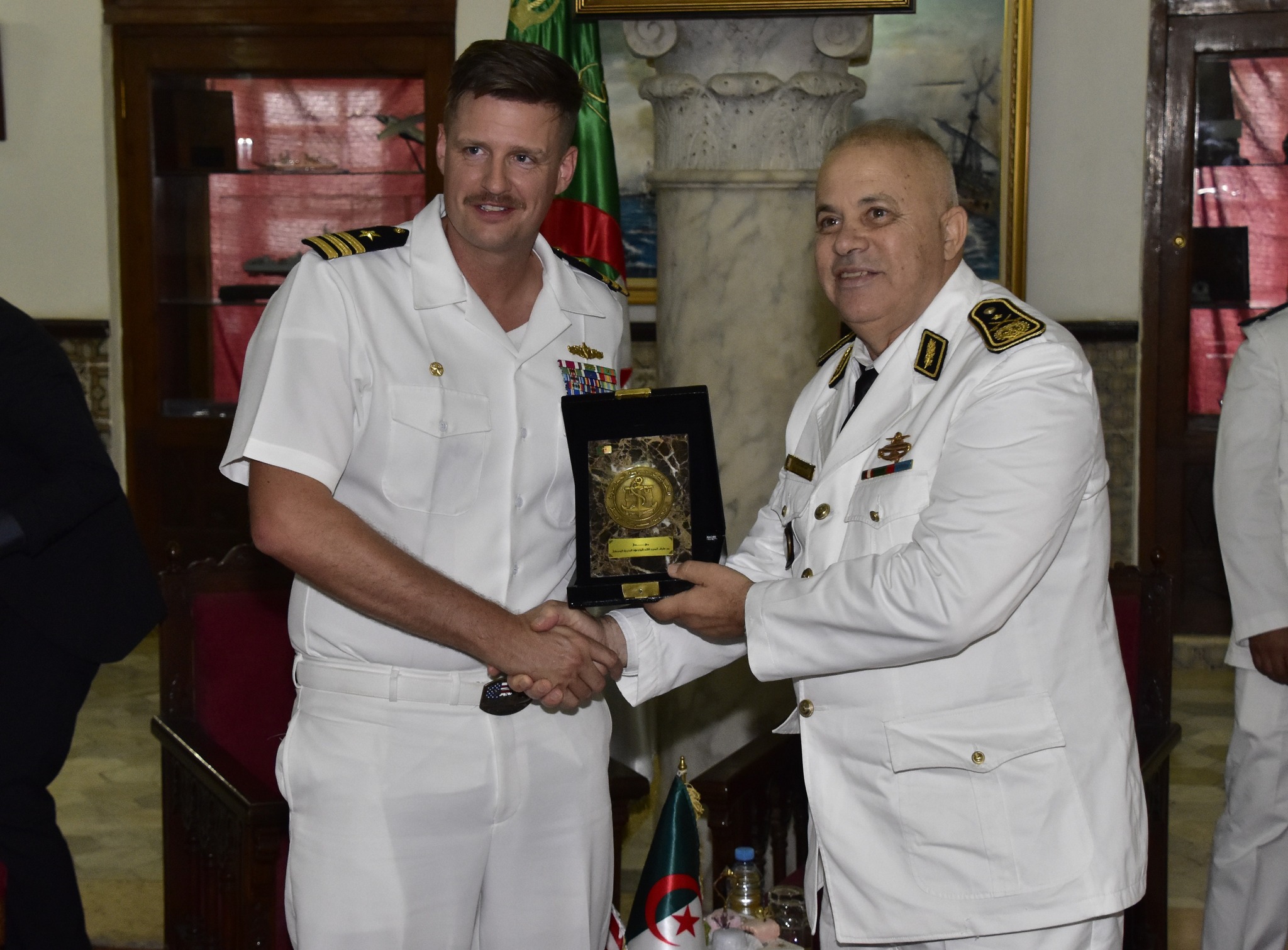 وقام قائد المهمة والوفد المرافق له خلال هذا التوقف وبمقر القاعدة البحرية الجزائر بالناحية العسكرية الأولى، بزيارة مجاملة إلى العميد قائد الواجهة البحرية الوسطى بالناحية العسكرية الأولى، حيث تم التطرق إلى سبل تعزيز التعاون الثنائي وتبادل الخبرات بين البحريتين الجزائرية والأمريكية.