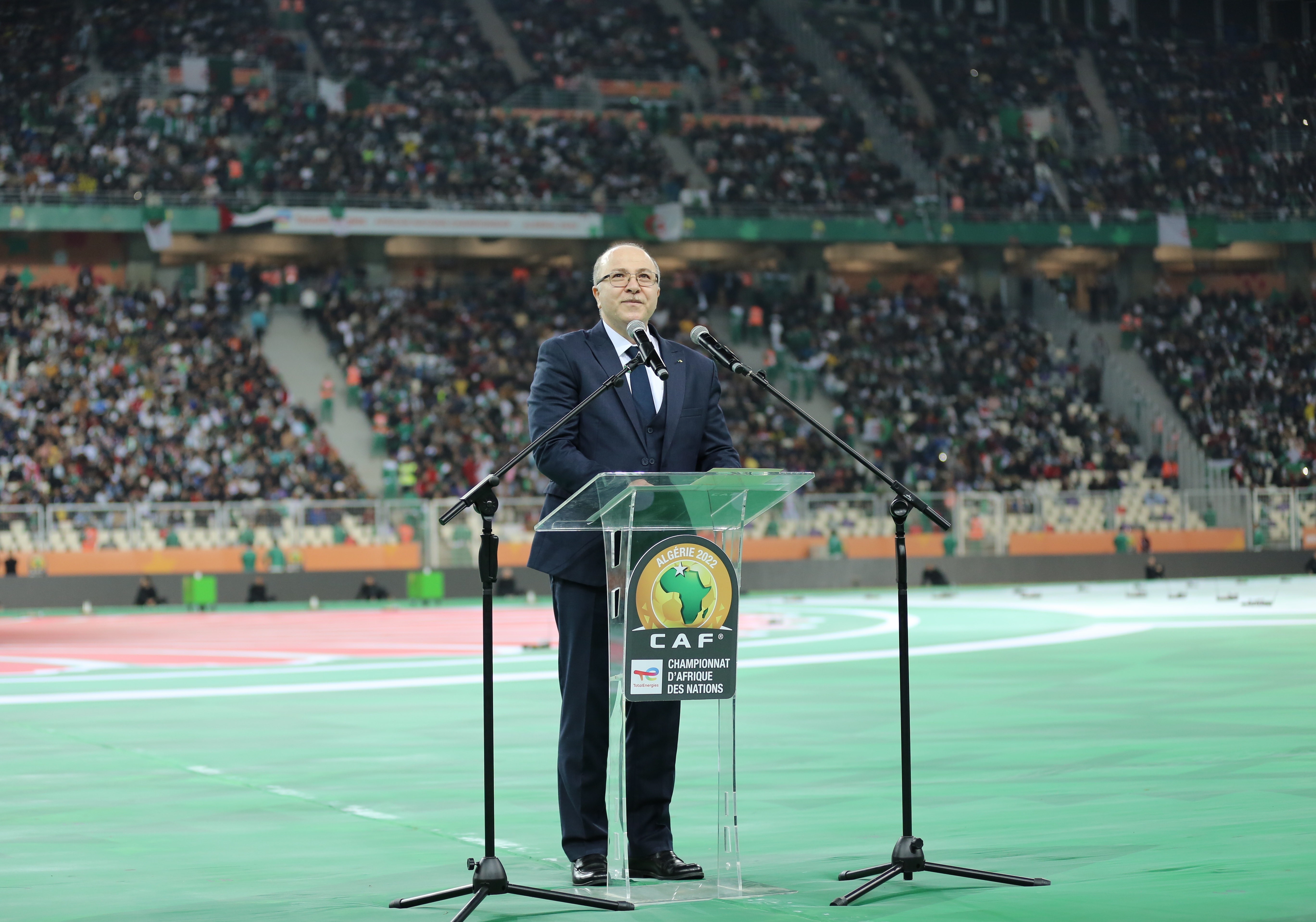 أشاد الوزير الأول الجزائري، أيمن بن عبد الرحمان، اليوم السبت، بالمستوى الرائع لحفل افتتاح الطبعة الـ7 لبطولة أمم إفريقيا لكرة القدم للمحليين “شان 2022″، الذي حضره أمس الجمعة، بملعب “نيلسون مانديلا” بالجزائر العاصمة، باسم الرئيس الجزائري، عبد المجيد تبون.