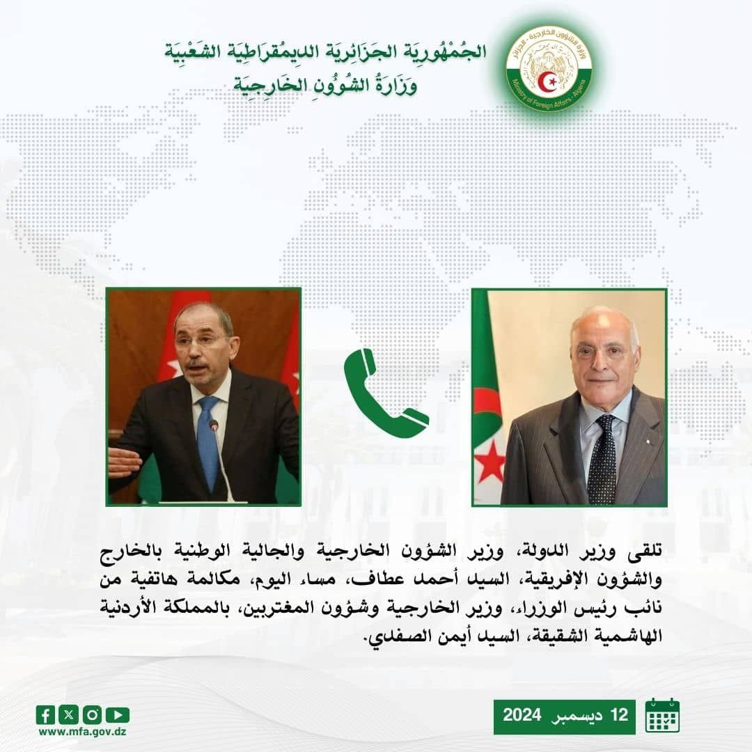 تلقى وزير الدولة، وزير الشؤون الخارجية والجالية الوطنية بالخارج والشؤون الإفريقية الجزائري، أحمد عطاف، مساء اليوم، مكالمة هاتفية من نائب رئيس الوزراء، وزير الخارجية وشؤون المغتربين بالمملكة الأردنية الهاشمية الشقيقة، أيمن الصفدي، حسب ما أورده بيان للخارجية الجزائرية.
