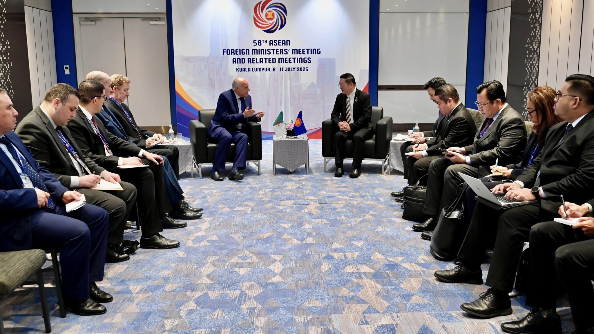 أجرى وزير الدولة، وزير الخارجية الجزائري، أحمد عطاف، اليوم الثلاثاء بكوالالمبور، محادثات ثنائية مع الأمين العام لرابطة دول جنوب شرق آسيا (آسيان)، كاو كيم هورن، وذلك عشية مشاركته في مراسم التوقيع على وثيقة انضمام الجزائر إلى معاهدة الصداقة والتعاون في جنوب شرق آسيا، حسب ما أفاد به بيان للخارجية الجزائرية.