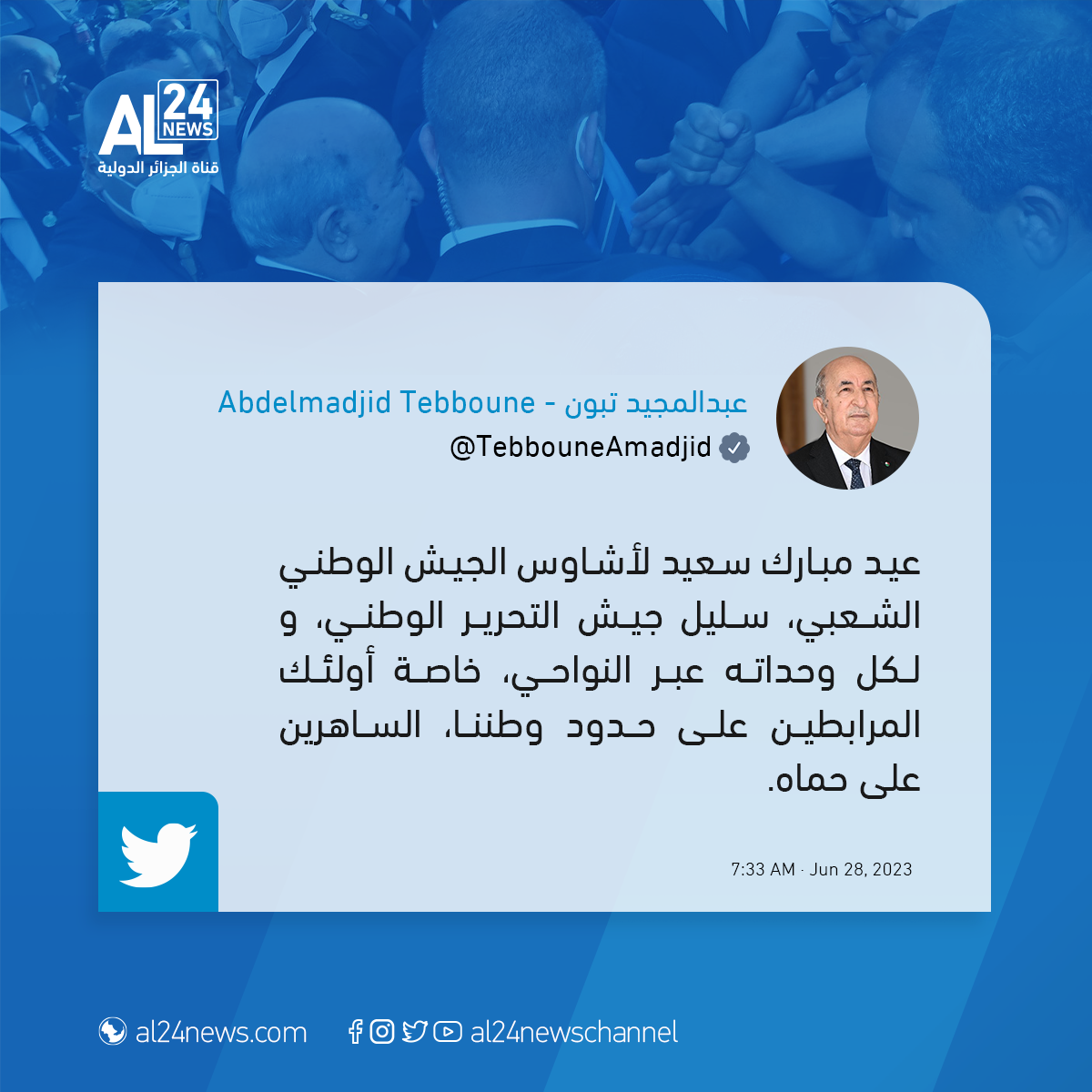 وكتب الرئيس تبون في صفحته الشخصية على ”تويتر”: “عيد مبارك سعيد لأشاوس الجيش الوطني الشعبي, سليل جيش التحرير الوطني, و لكل وحداته عبر النواحي, خاصة أولئك المرابطين على حدود وطننا، الساهرين على حماه”.