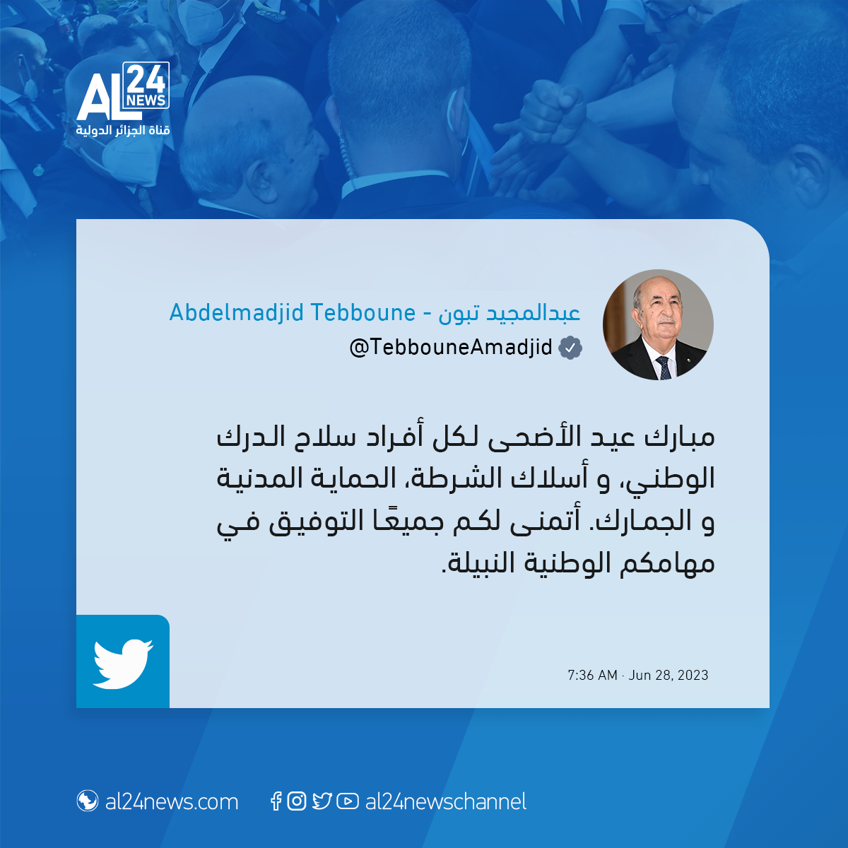 تقدم الرئيس الجزائري، عبد المجيد تبون, صباح اليوم الأربعاء, بمناسبة عيد الأضحى المبارك, بتهانيه إلى أفراد الجيش