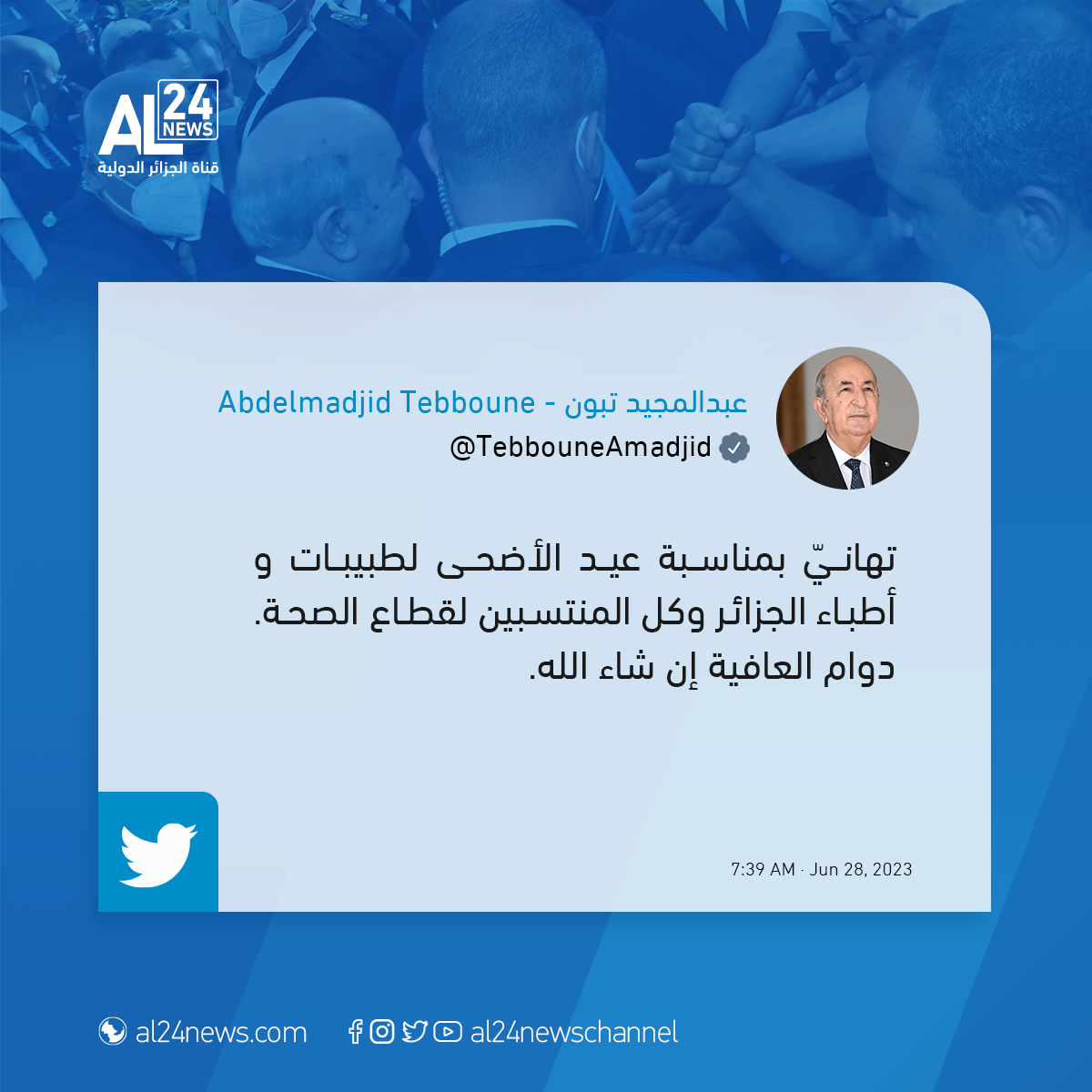 وبذات المناسبة, تقدم الرئيس تبون بتهانيه لأطباء الجزائر وكافة المنتسبين لقطاع الصحة, قائلا : “تهاني بمناسبة عيد الأضحى لطبيبات و أطباء الجزائر, وكل المنتسبين لقطاع الصحة. دوام العافية إن شاء الله”.