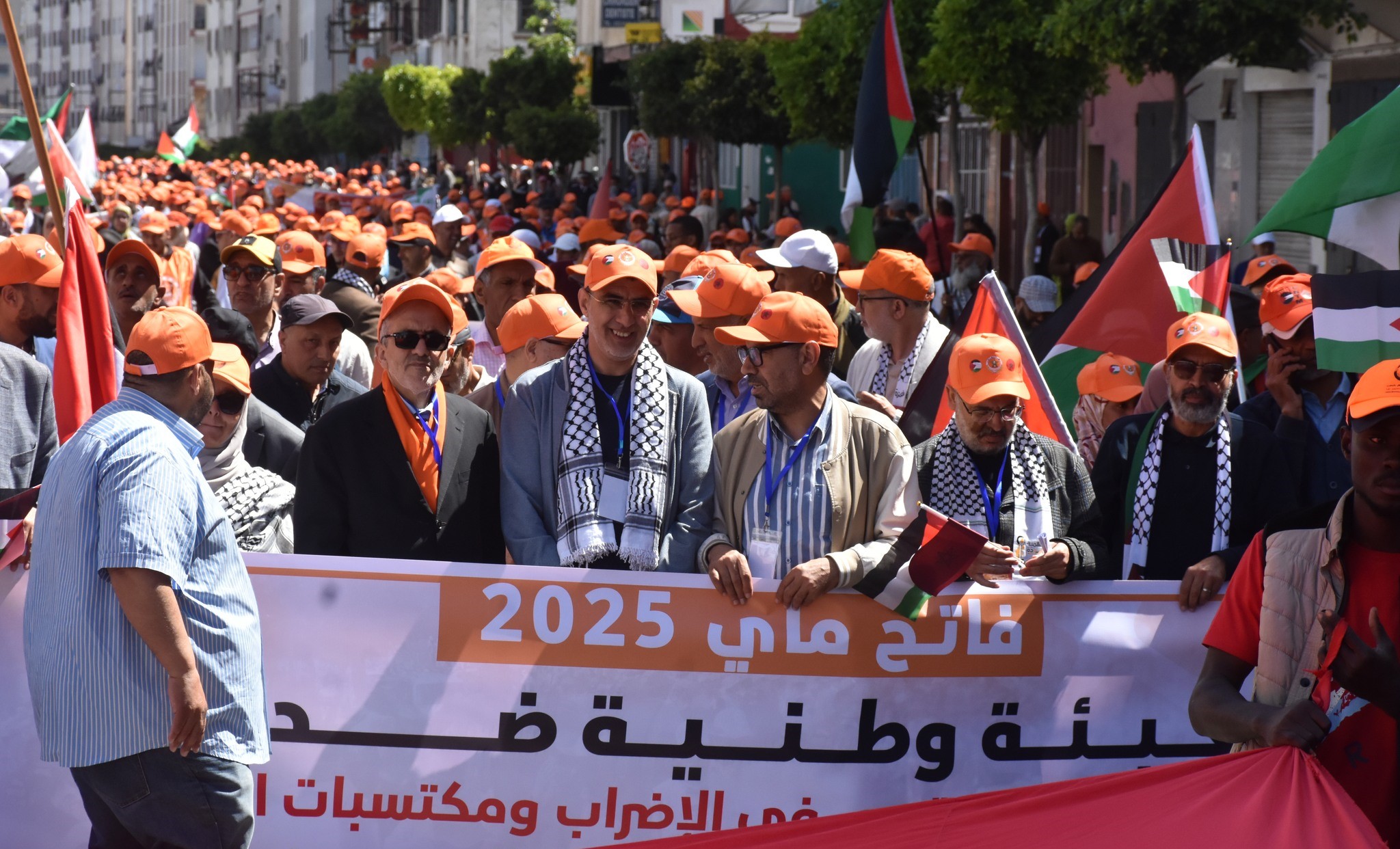 و شهدت كل من العاصمة الرباط والدار البيضاء والجديدة وأكادير وتزنيت وطنجة وتطوان مسيرات عمالية نظمتها المركزيات النقابية (الاتحاد المغربي للشغل -أكبر نقابة- والاتحاد الوطني للشغل بالمغرب والكونفدرالية الديمقراطية للشغل والمنظمة الديمقراطية للشغل والاتحاد العام للشغالين بالمغرب) للمطالبة بتحسين الوضع الاجتماعي الكارثي والتعبير عن الاستنكار من عجز الحكومة في تدبير الشأن العام ومواجهة التحديات والأوضاع الصعبة للمغاربة على مختلف المستويات، كما رفعت شعارات تطالب بإسقاط كافة أشكال التطبيع مع الكيان الصهيوني الذي يواصل ابادة الفلسطينيين في قطاع غزة وإحراق العلم الصهيوني.