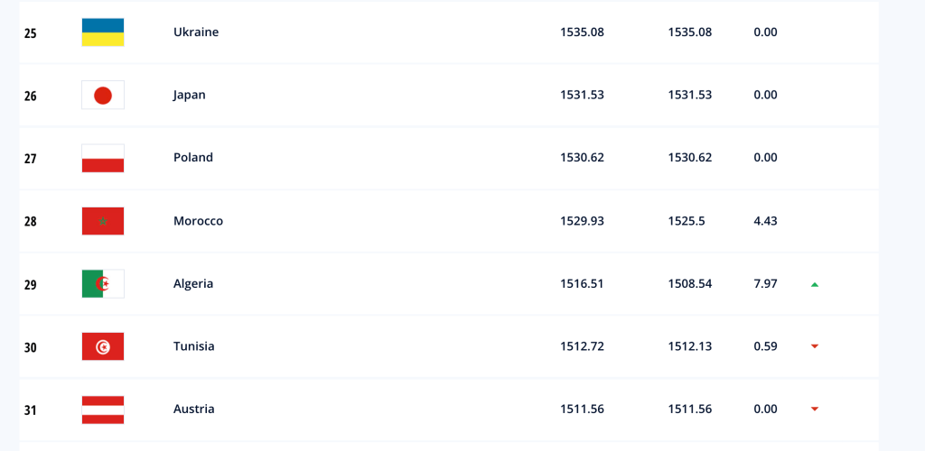 فضلا عن ذلك، انتزع منتخب الجزائر المركز الثالث على الصعيد الأفريقي من تونس التي تراجعت للترتيب الرابع بـ 1512.72 نقطة، مستفيدا من تتويجه بلقب كأس العرب على حساب نسور قرطاج في النهائي بهدفين دون رد
