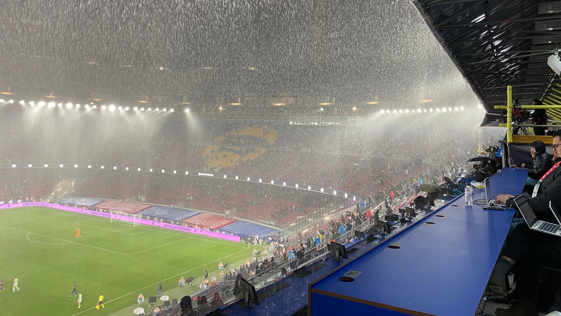 غير أن الحدث الأبرز في اللقاء لم يكن الأهداف الثلاثة، بل غزارة الأمطار التي أغرقت أجزاء من الملعب، حيث تسرّبت المياه إلى مقصورة الصحافيين، ما اضطر عددا منهم إلى مغادرتها والبحث عن أماكن بديلة في المدرجات.