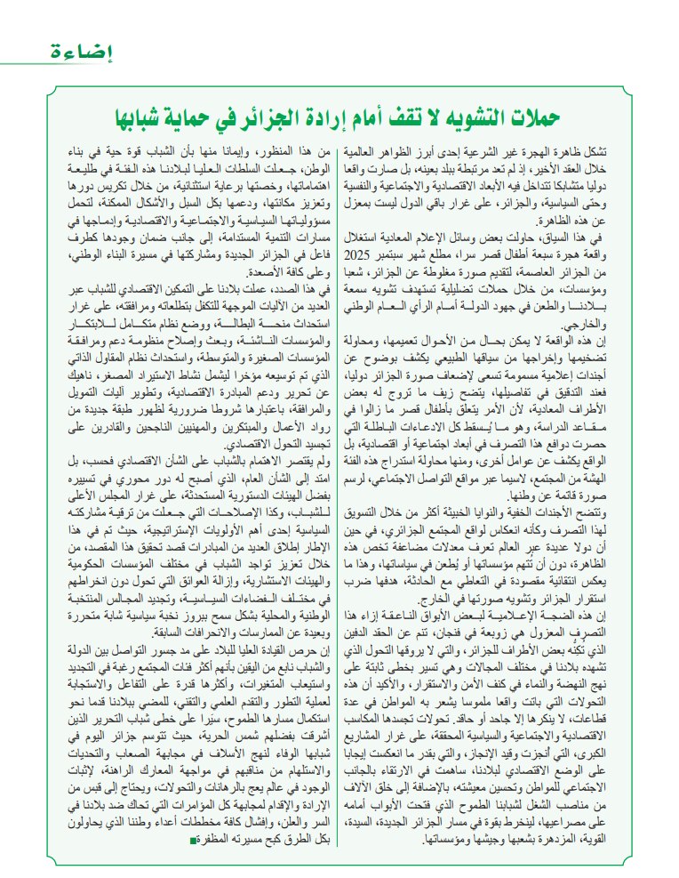 أكدت مجلة “الجيش”، في عددها لشهر سبتمبر، أن حملات التشويه والتضليل التي تمارسها وسائل الإعلام المعادية، لن تقف أمام إرادة الجزائر في حماية شبابها.