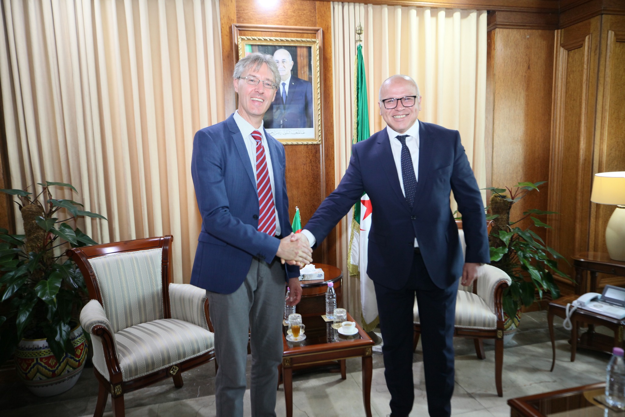 استقبل كاتب الدولة لدى وزير الطاقة المكلف بالطاقات المتجددة الجزائري، نور الدين ياسع، اليوم الاثنين، المستشار المختص بالتعاون الدولي لمنطقة الشرق الأوسط وشمال إفريقيا لدى المعهد الألماني للقياس (PTB) التابع لوزارة التعاون الاقتصادي والتنمية الألمانية، كارل فيليكس وولف، وذلك على هامش فعاليات معرض التجارة البينية الإفريقية المنعقد بالجزائر العاصمة من 4 إلى 10 سبتمبر الجاري.