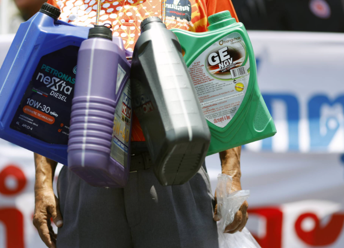 متظاهر يحمل عبوات نفط بلاستيكية خلال مظاهرة احتجاجاً على ارتفاع أسعار الوقود وتكاليف المعيشة أمام مقر الحكومة في بانكوك (إ.ب.أ)