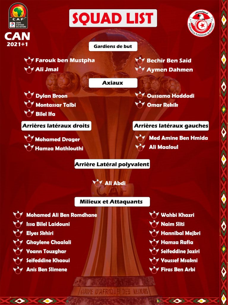 أعلن الاتحاد التونسي لكرة القدم اليوم الخميس عن قائمة اللاعبين الذين سيشاركون بكأس الأمم الإفريقية الكاميرون 2022