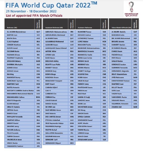 كشف الاتحاد الدولي لكرة القدم “الفيفا” اليوم الخميس عن أسماء الحكام الذين سيديرون مباريات كأس العالم قطر 2022.