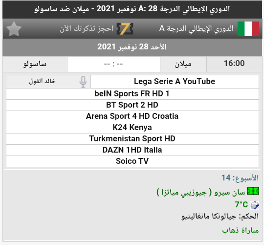 يحل نادي ساسولو ضيفا على نادي ميلان، مساء اليوم الاحد، على أرضية ملعب “سان سيرو” ضمن منافسات الجولة الـ 14 من مسابقة الدوري الإيطالي.