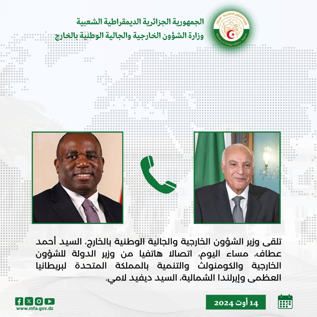 تلقى وزير الخارجية الجزائري، أحمد عطاف، مساء اليوم الأربعاء، اتصالا هاتفيا من وزير الدولة للشؤون الخارجية والكومنولث والتنمية بالمملكة المتحدة لبريطانيا العظمى وإيرلندا الشمالية، ديفيد لامي، حسب ما أفاد به بيان للخارجية الجزائرية.