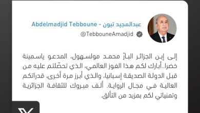 هنأ الرئيس الجزائري عبد المجيد تبون، اليوم الأربعاء، عبر حسابه على منصة إكس، الروائي محمد مولسهول المدعو ياسمينة خضرا، عقب…