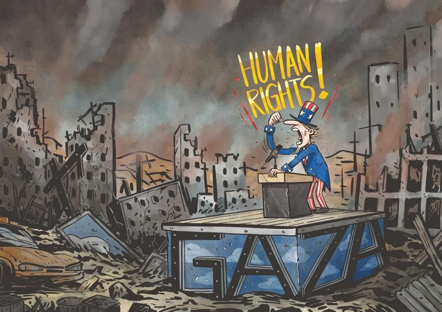 One of Chinese English-language newspapers has challenged United States’ claims on human rights by publishing a cartoon on the situation in Gaza amid the Zionist entity’s genocidal war there.