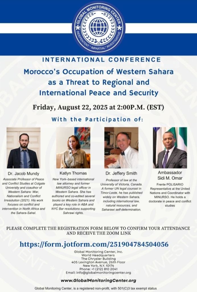 The U.S.-based Global Monitoring Center will host tomorrow, Friday, in New York, an international conference under the theme “Morocco’s Occupation of Western Sahara as a Threat to Regional and International Peace and Security”, with the participation of experts, researchers, and representatives of diplomatic missions accredited to the United Nations.