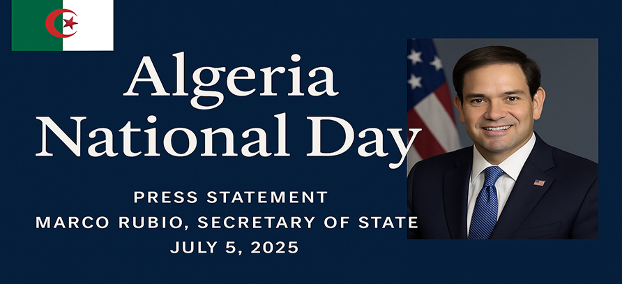 WASHINGTON – On behalf of the United States of America, Secretary of State Marco Rubio extended warm congratulations to the Government and people of Algeria on the occasion of their 63rd National Day, celebrated on July 5.